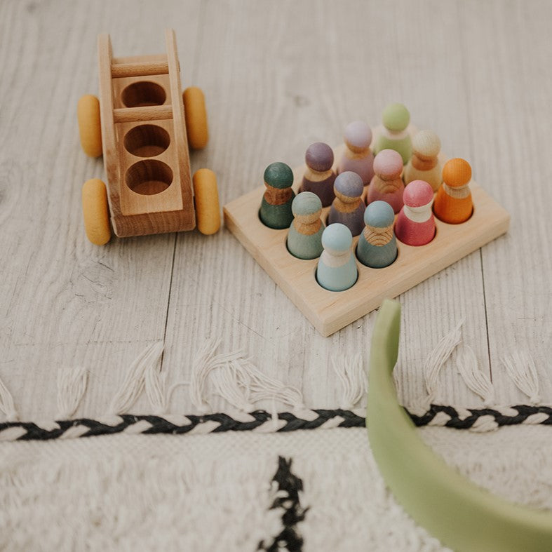 Through their different colours and different types of wood, the Rainbow Friends reflect our wonderful diverse world as well as celebrating everyone's uniqueness. Each one of our little hand-painted wooden figures has a different look and individual wood grain. These happy little wooden figures, made from different types of wood from trees indigenous to central Europe, are gender neutral. With no specific facial expression, they can be either sad or happy. With their simple appearance they spur on the child's imagination instead of restricting it by offering too much detail.