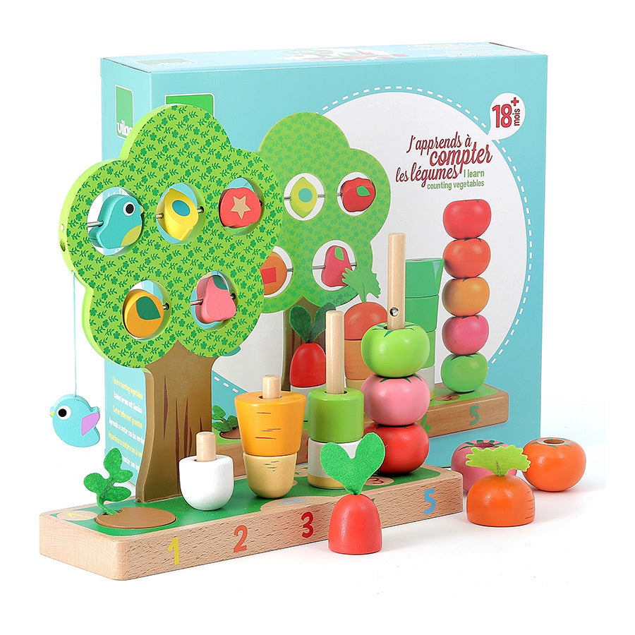 J'apprends a compter les legumes jeu d'activite en bois par VILAC. De jolis legumes a empiler - et une pomme de terre a deterrer! Au verso de chaque element dans l'arbre se cache une forme a decouvrir.. 26cm de longueur.