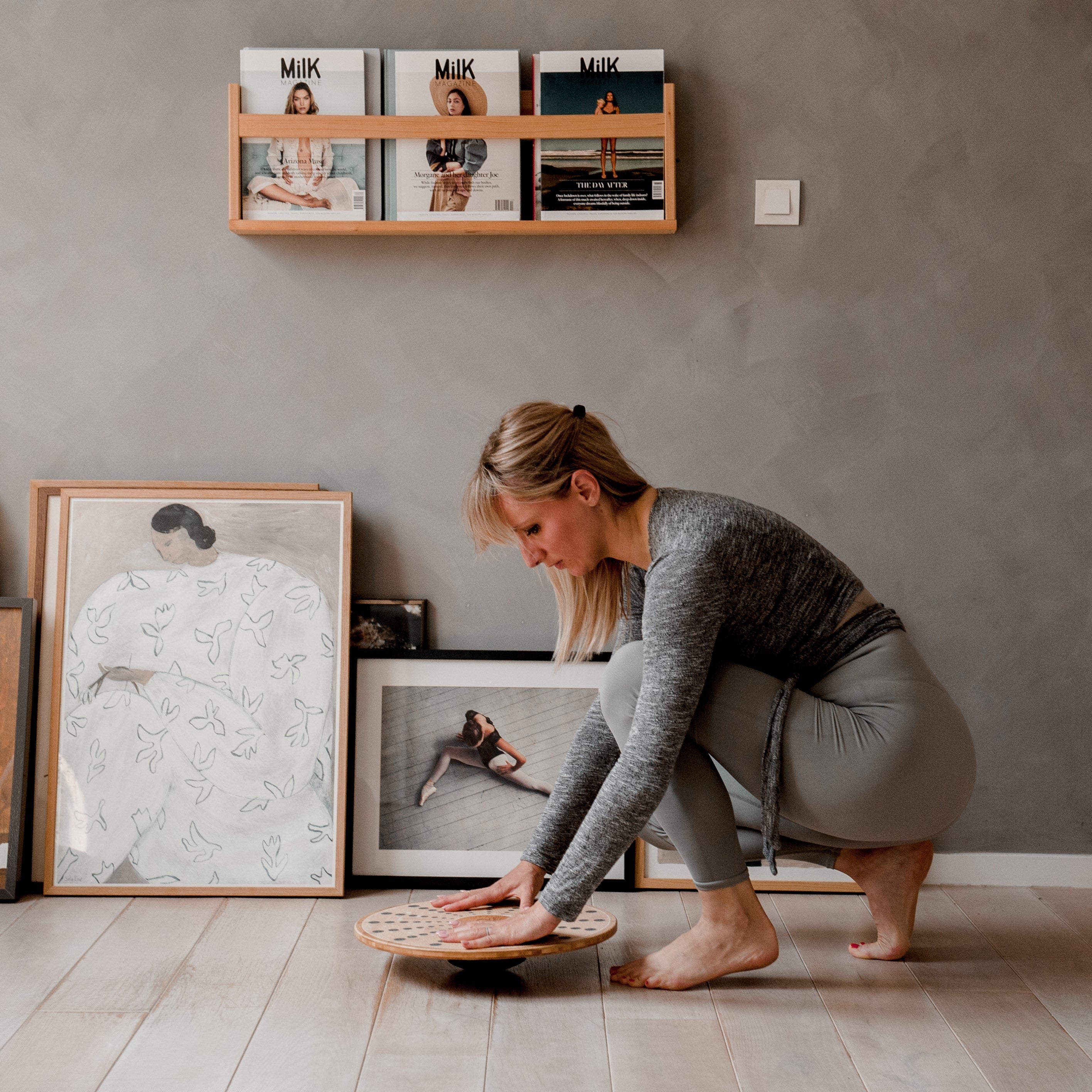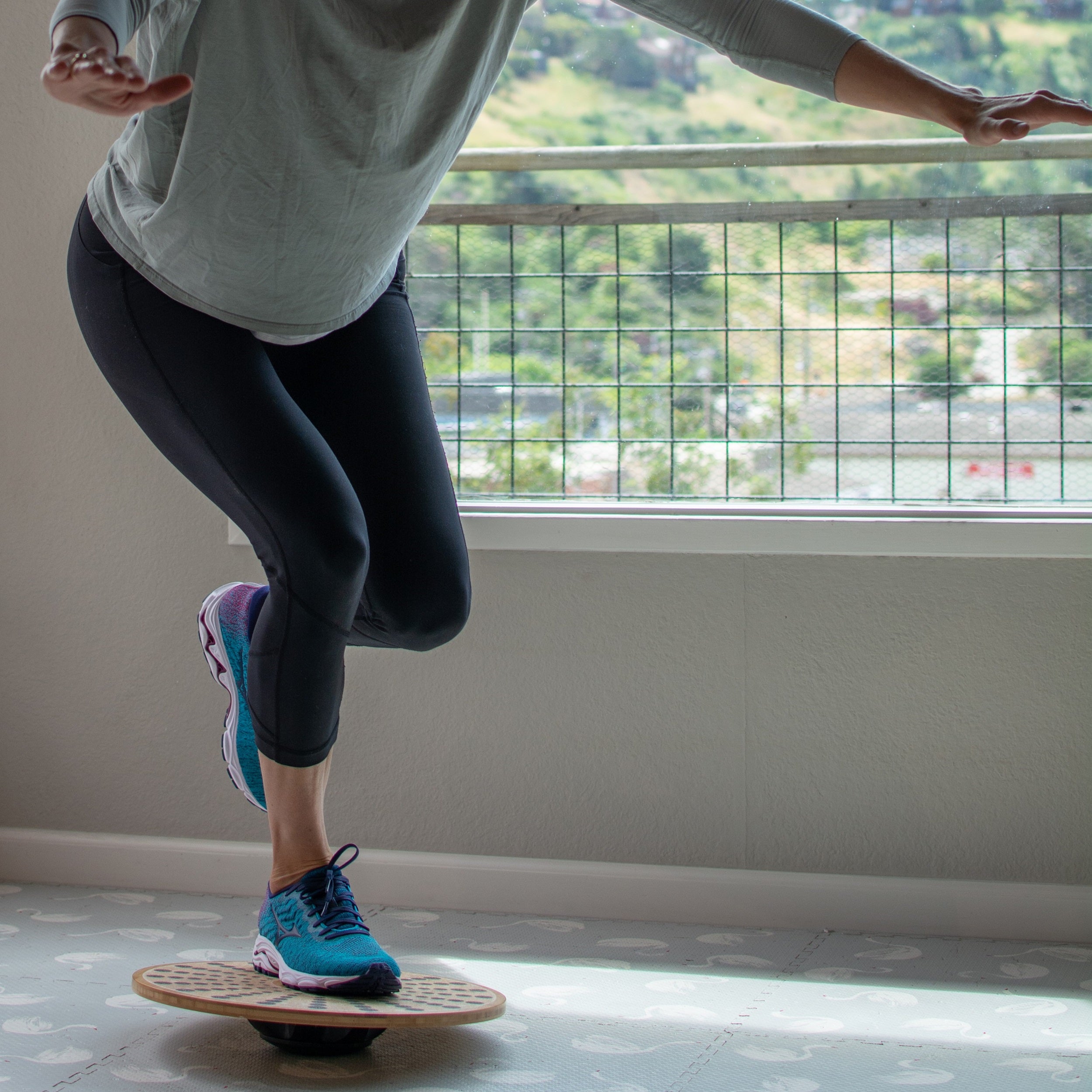 Children can test their balance and coordination while developing important muscle groups and improving their concentration ability. Parents can practice balancing with good posture while working at a standing desk, or a teenage sibling can attempt balancing squats to develop core and lower-body strength.