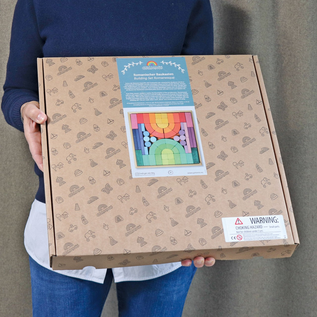 Grimm's large Romanesque Building Set includes 62 building blocks in wooden frame.