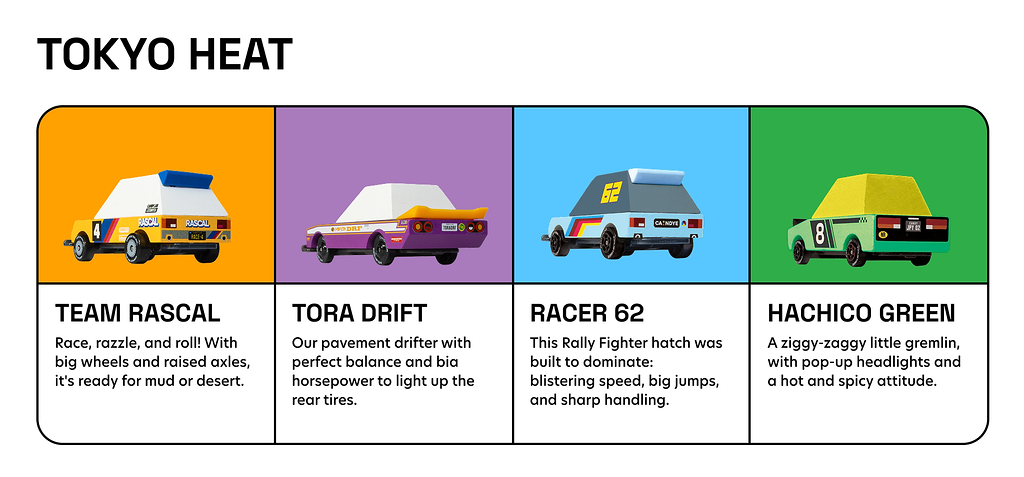 Small cars. Big attitudes. CANDYCAR® TOONS™ is a fresh fleet of sturdier, more colorful, and more affordable toy cars. Still wooden. Still diecast. Still awesome. Includes: