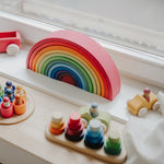 Grimms rainbow figures are hand-painted, gender neutral, and because they do not have a fixed facial expression, they can be either sad or happy. With their simple appearance they spur on the child's imagination instead of restricting it by offering too much detail.