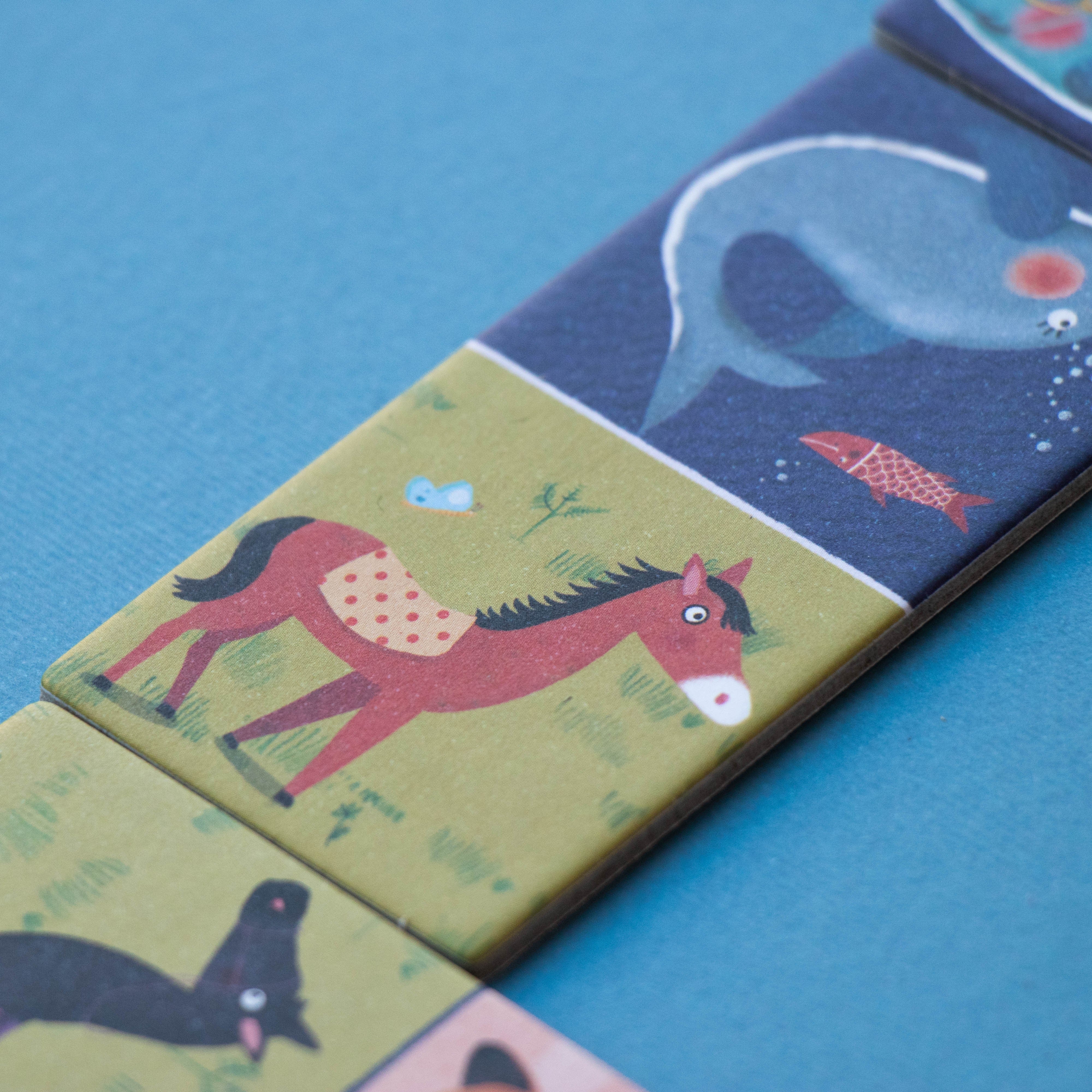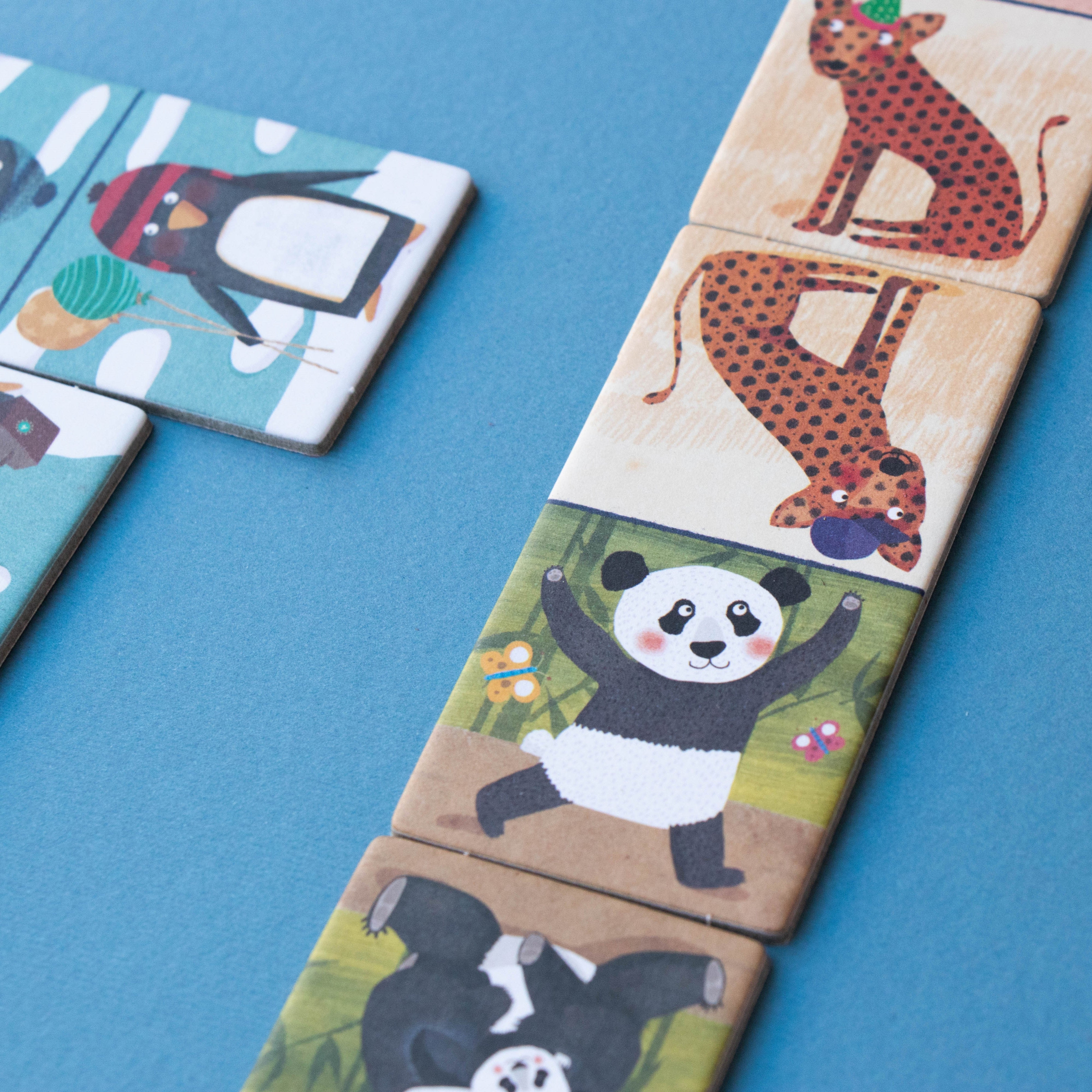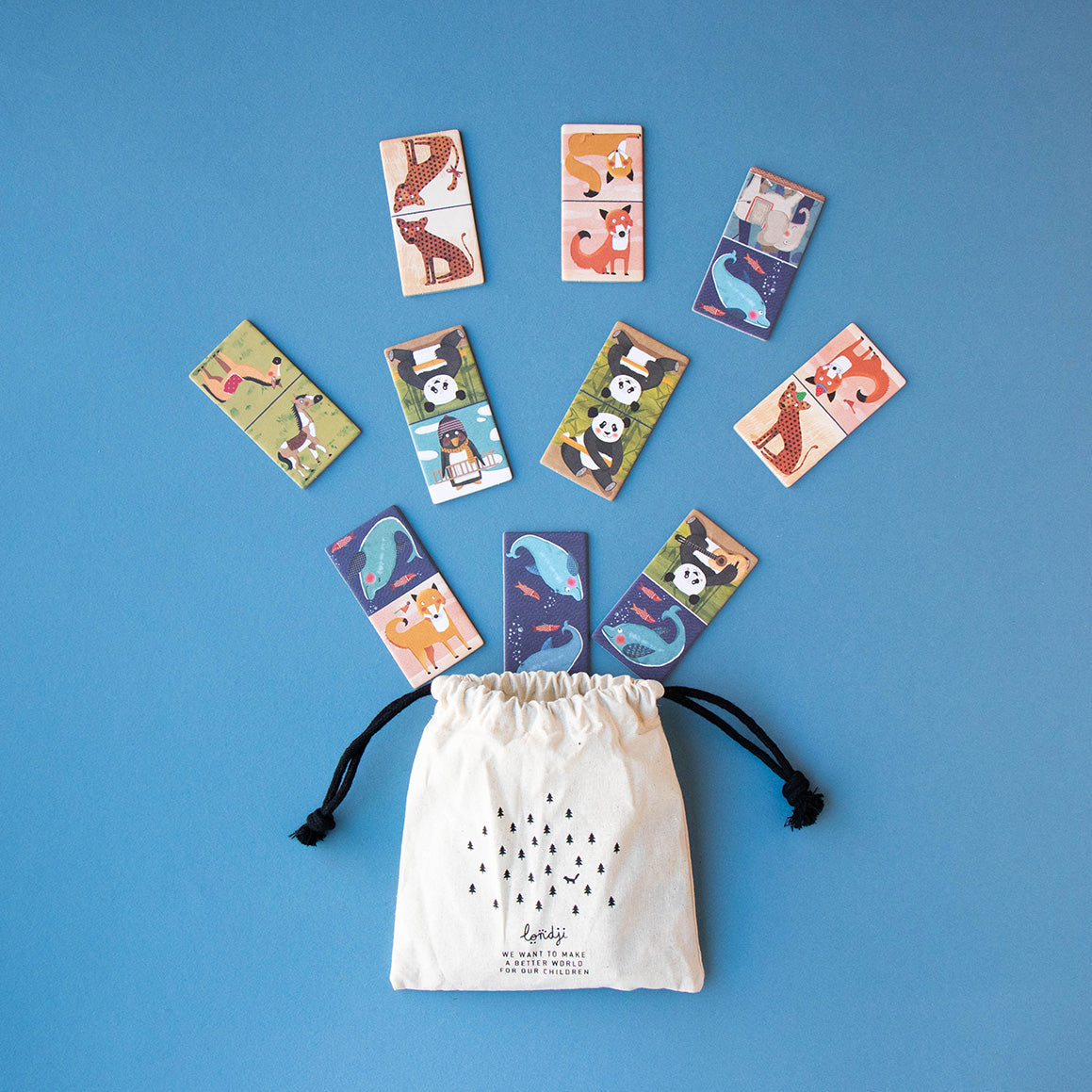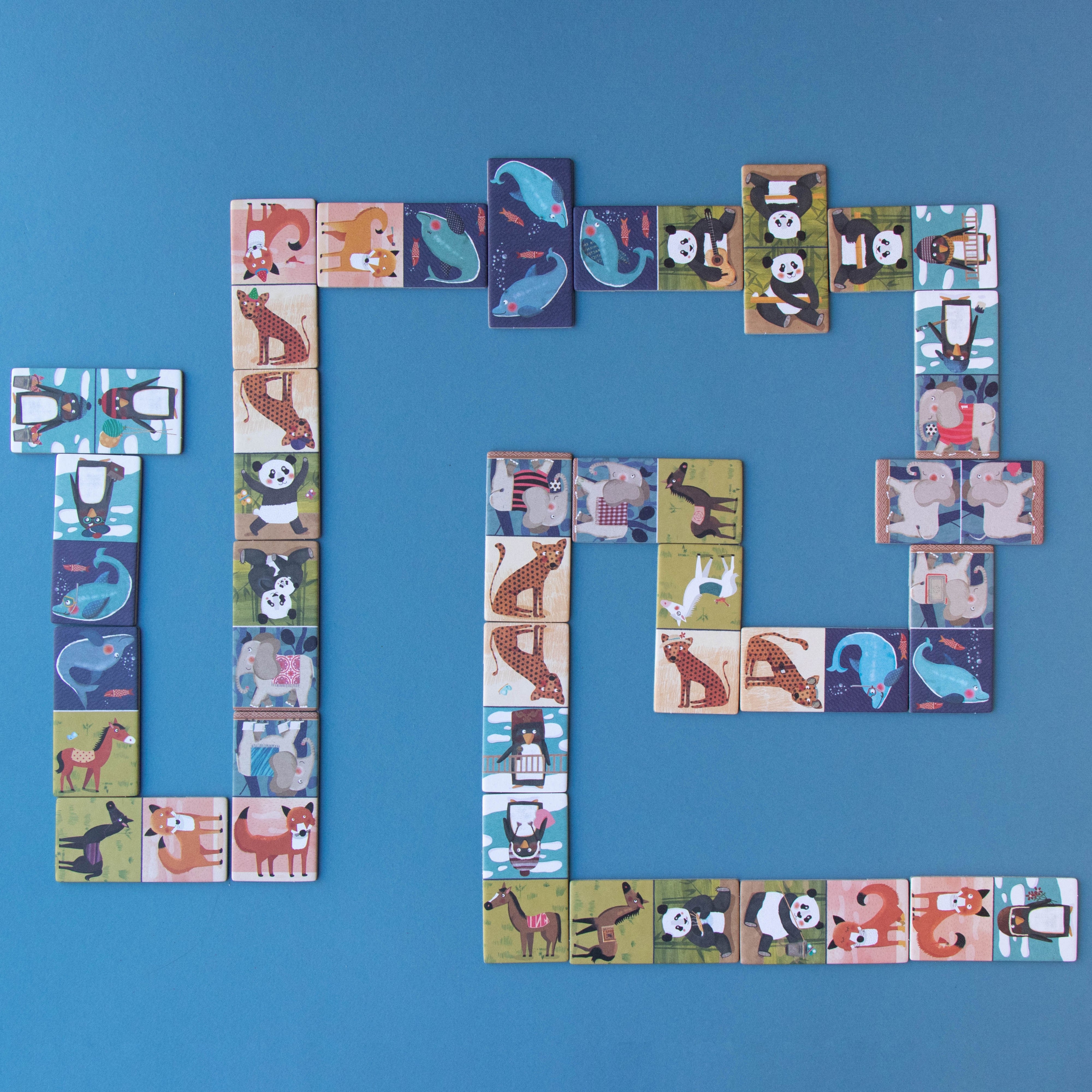 Penguins & friends domino set Made in Barcelona by Londji. includes 28 illustrated tiles featuring artwork of Txell Darne; win the game by being the first to play all your domino tiles. Full instructions included in the box.Made using recycled cardboard and paper. Packaged in sturdy box.