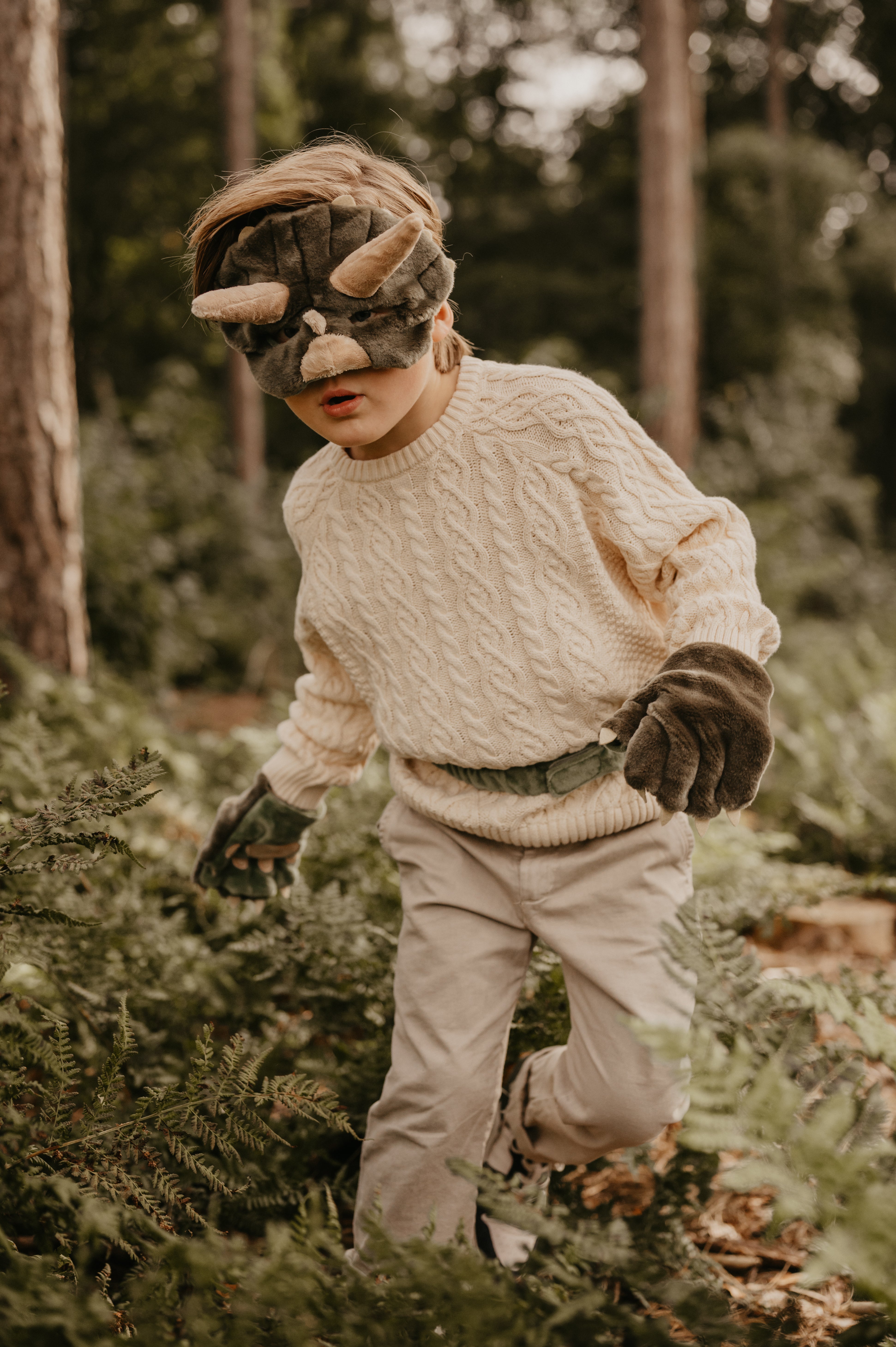 Let your imagination run wild with the new dino dress-up set. Transform into this tough dinosaur and go on the craziest adventures. This set includes a mask, tail and matching gloves. It is the ideal gift for hours of fun!