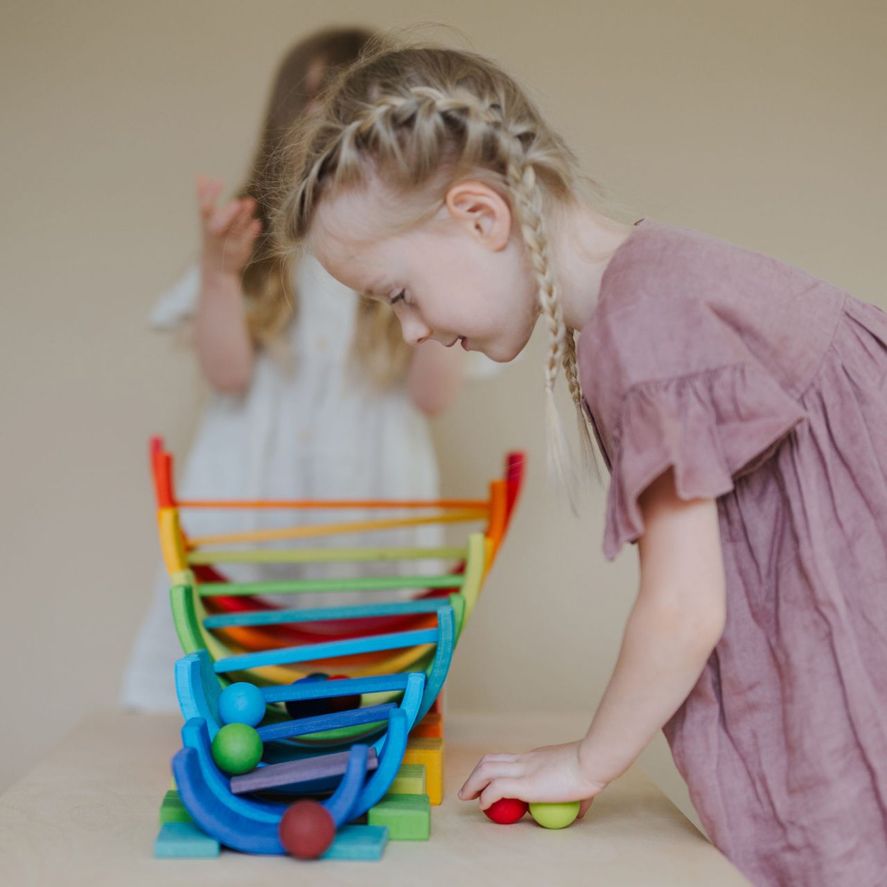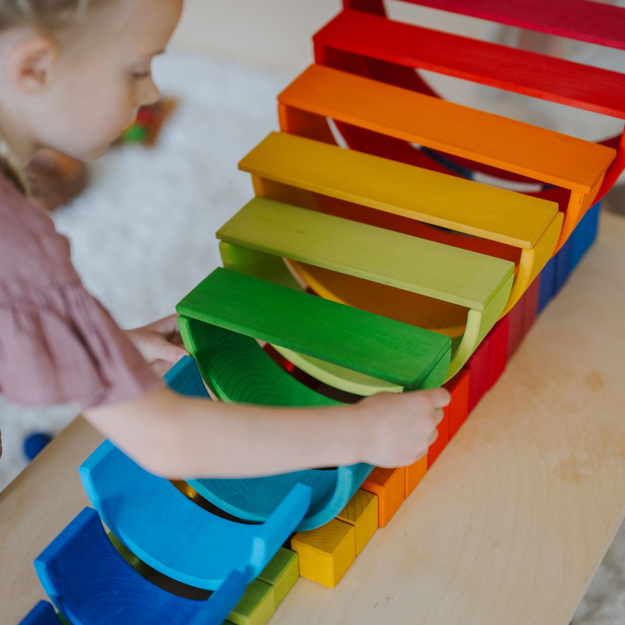 The large Rainbow is a wonderful tool for open-ended play! Toddlers stack, sort and build and as the children get older they will use it as a cradle for dolls, as fence for animals, like a tunnel or bridge for vehicles, as house for dwarfs and dollhouse dolls, build amazing sculptures... this rainbow will always be integrated in playing with a lot of fantasy.