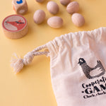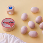 Designed and manufactured in Catalonia by Londji. Includes 1 game board (22x71cm), 1 wooden fox, 1 wooden die, 24 wooden eggs and 4 egg cartons.