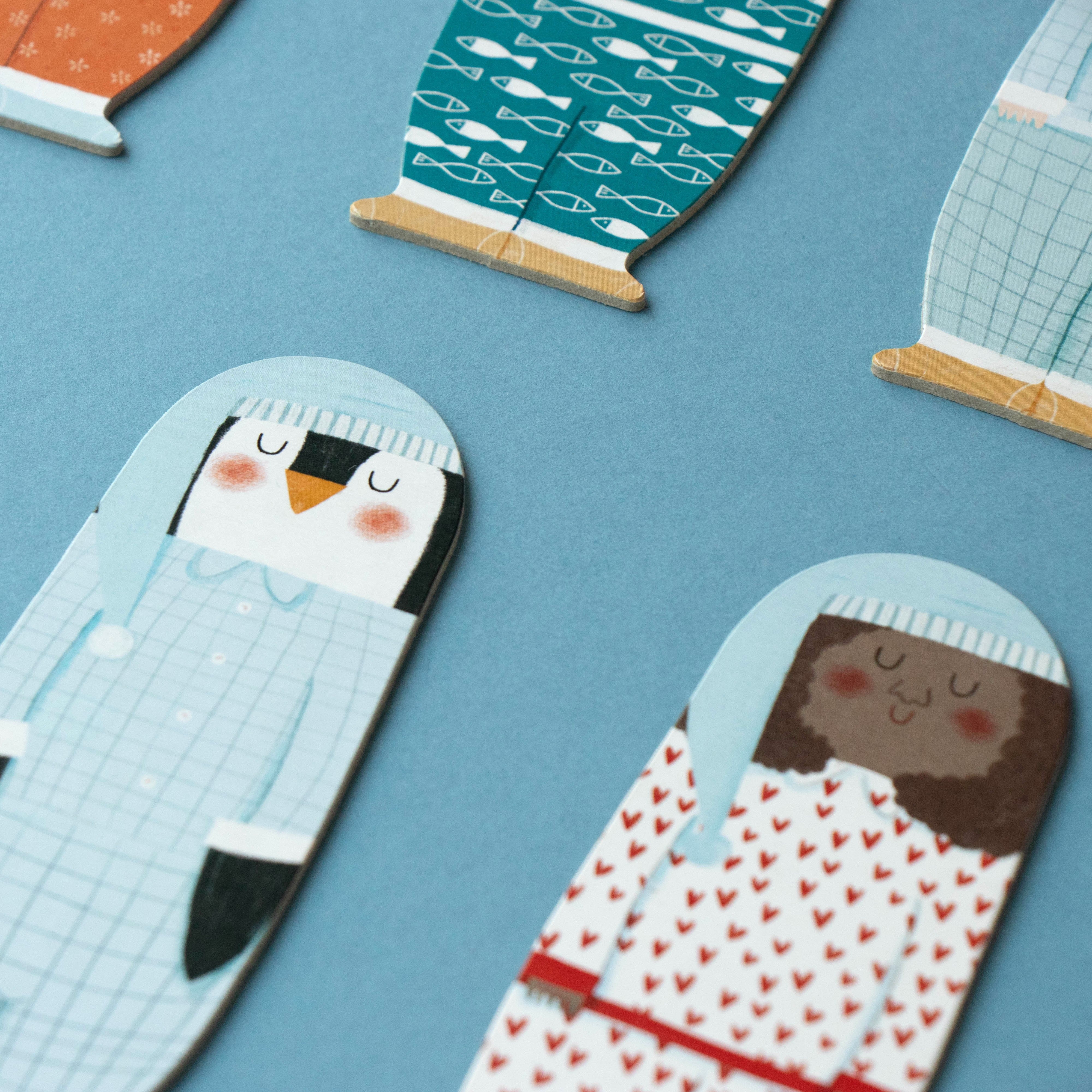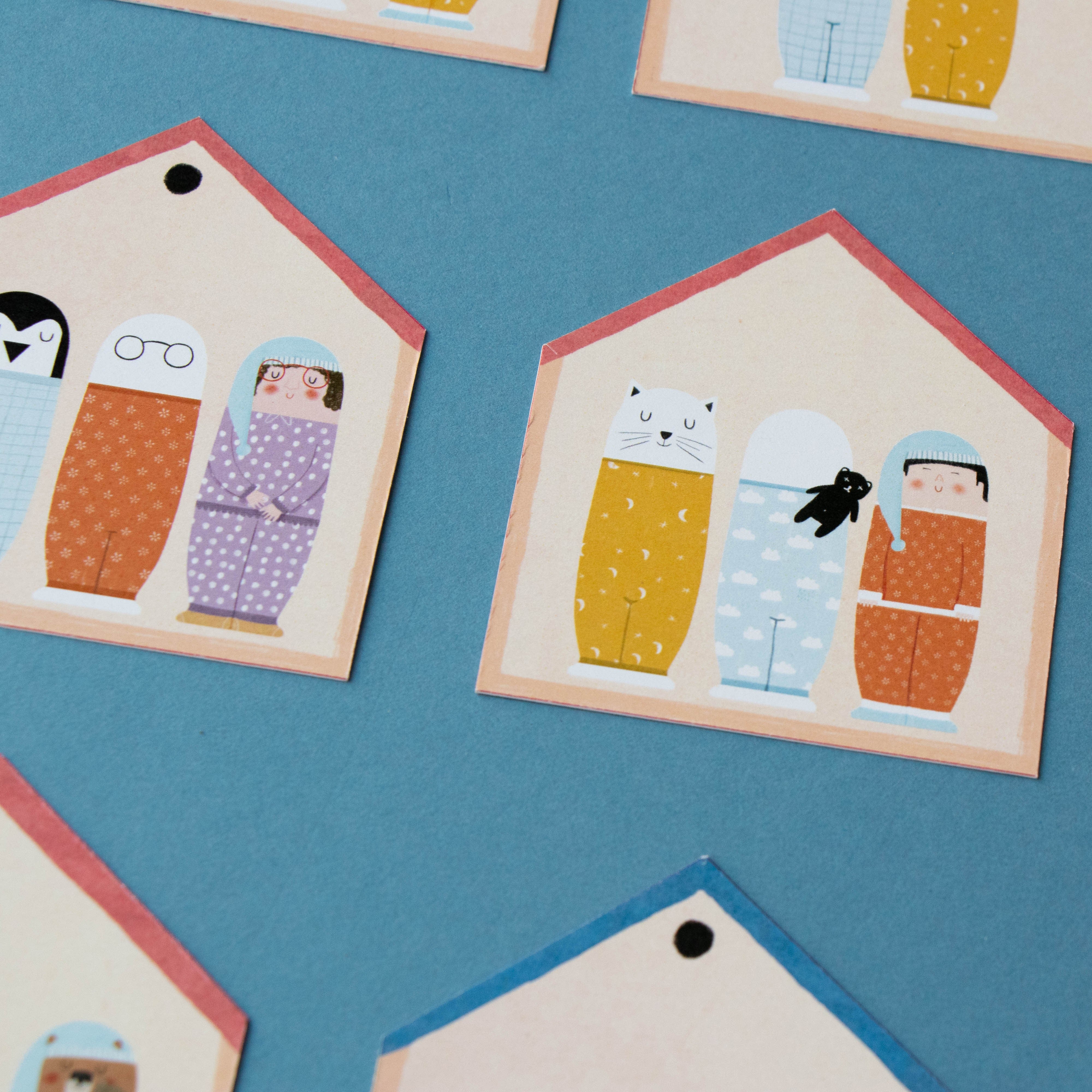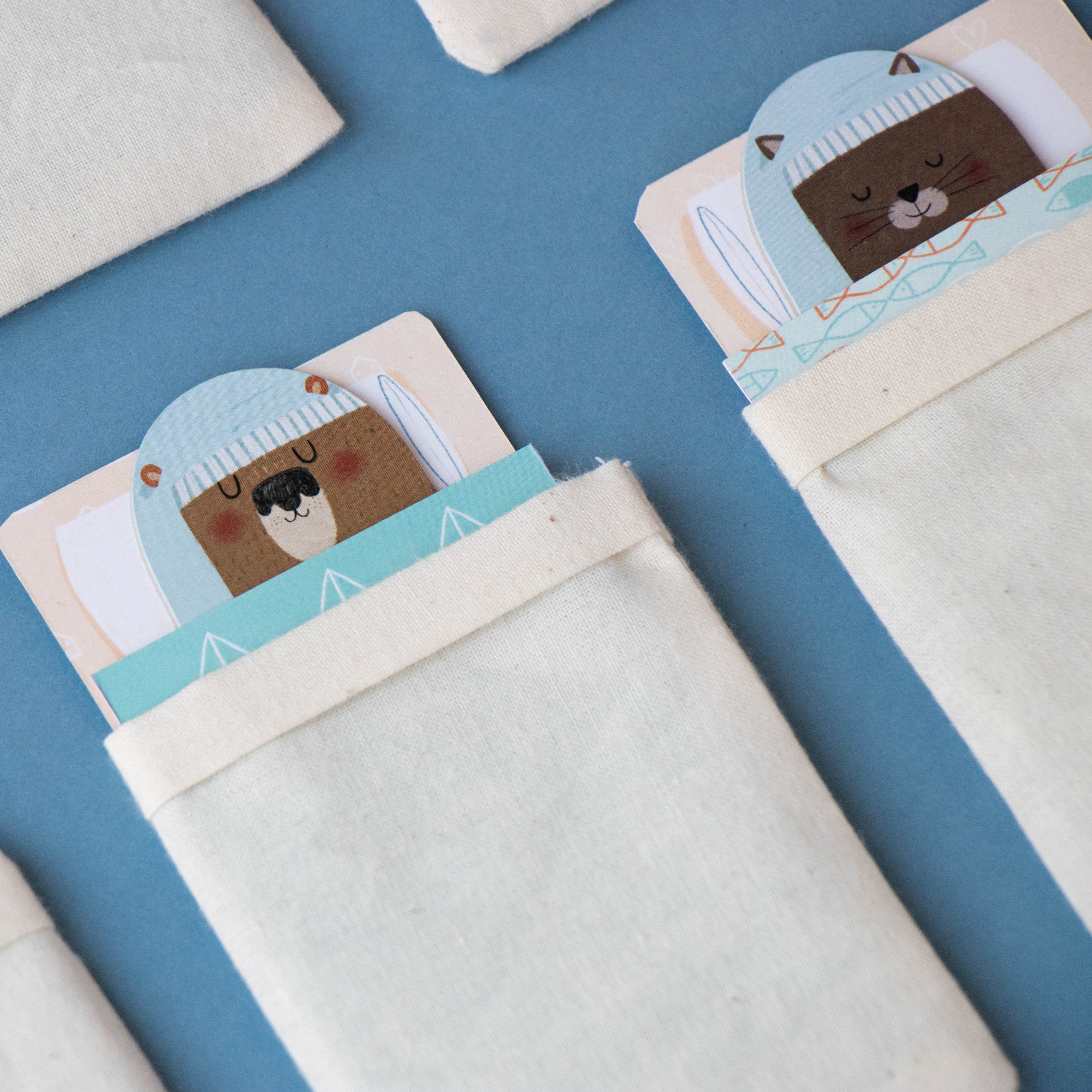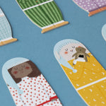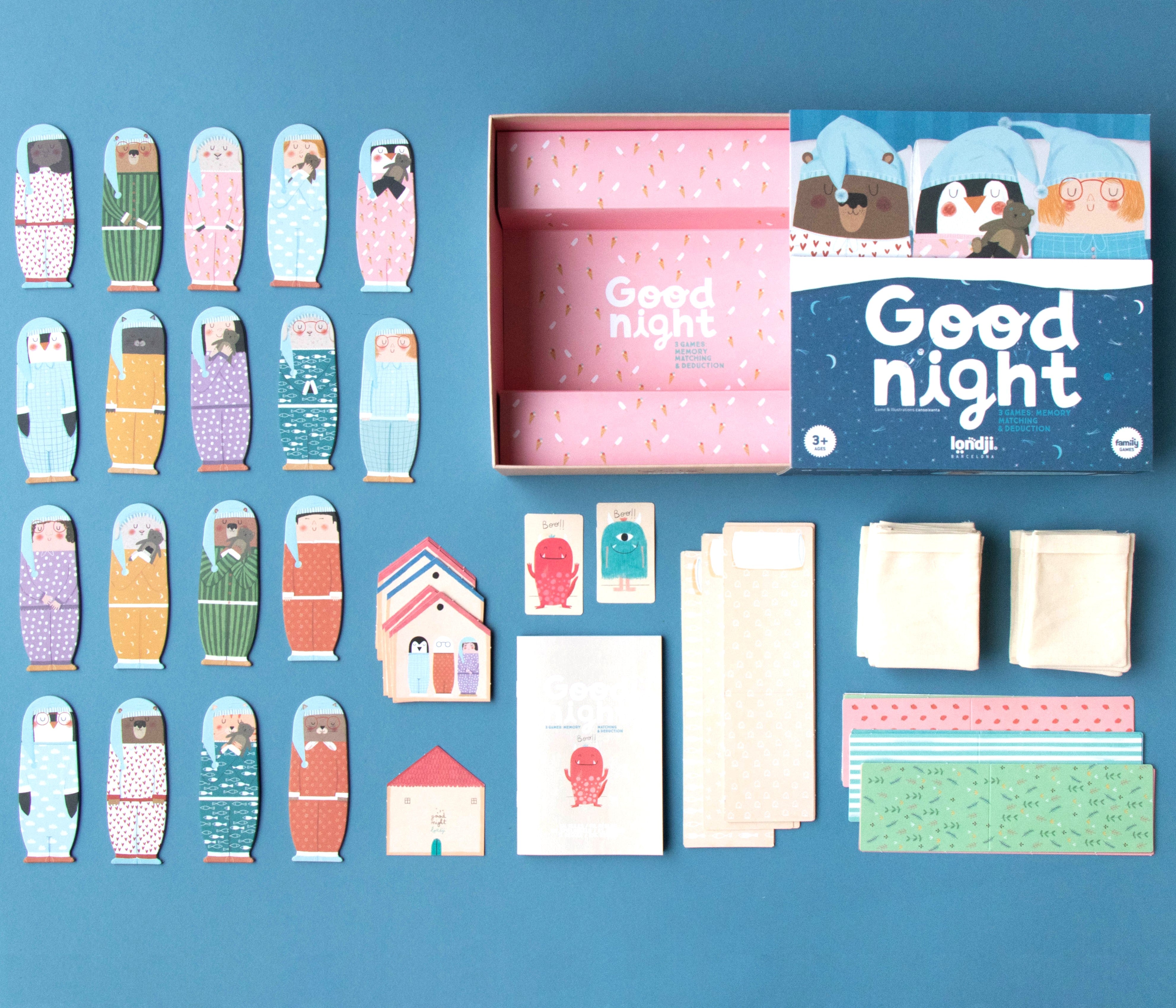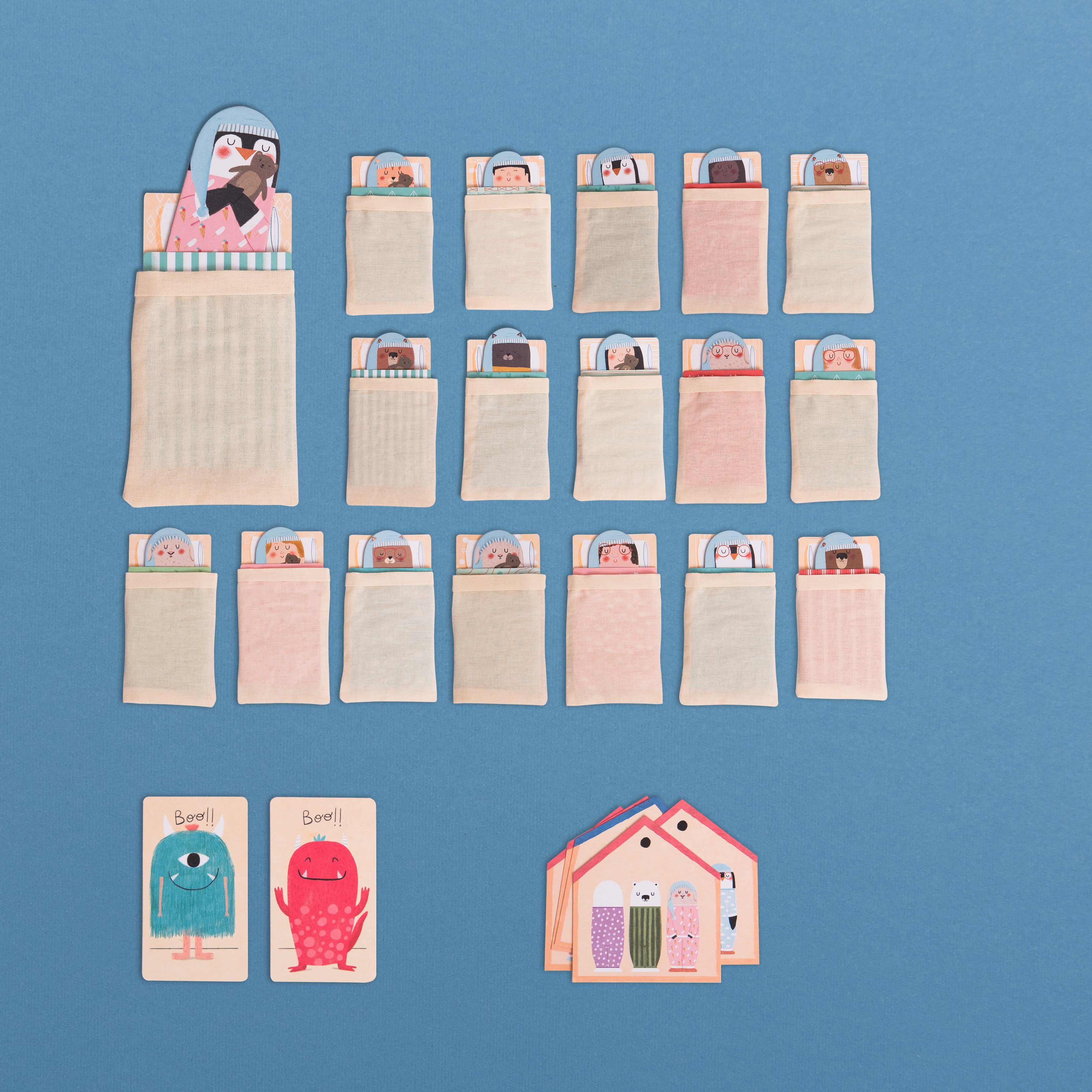 A game with 3 ways to play: memory, matching and deduction for young children. Our sleepy little friends are ready for bed. Who's wearing the same pajamas? Who's sleeping at my house? Where is the monster under the bed? Good night! Made in Barcelona with illustrations by Can Seixanta.