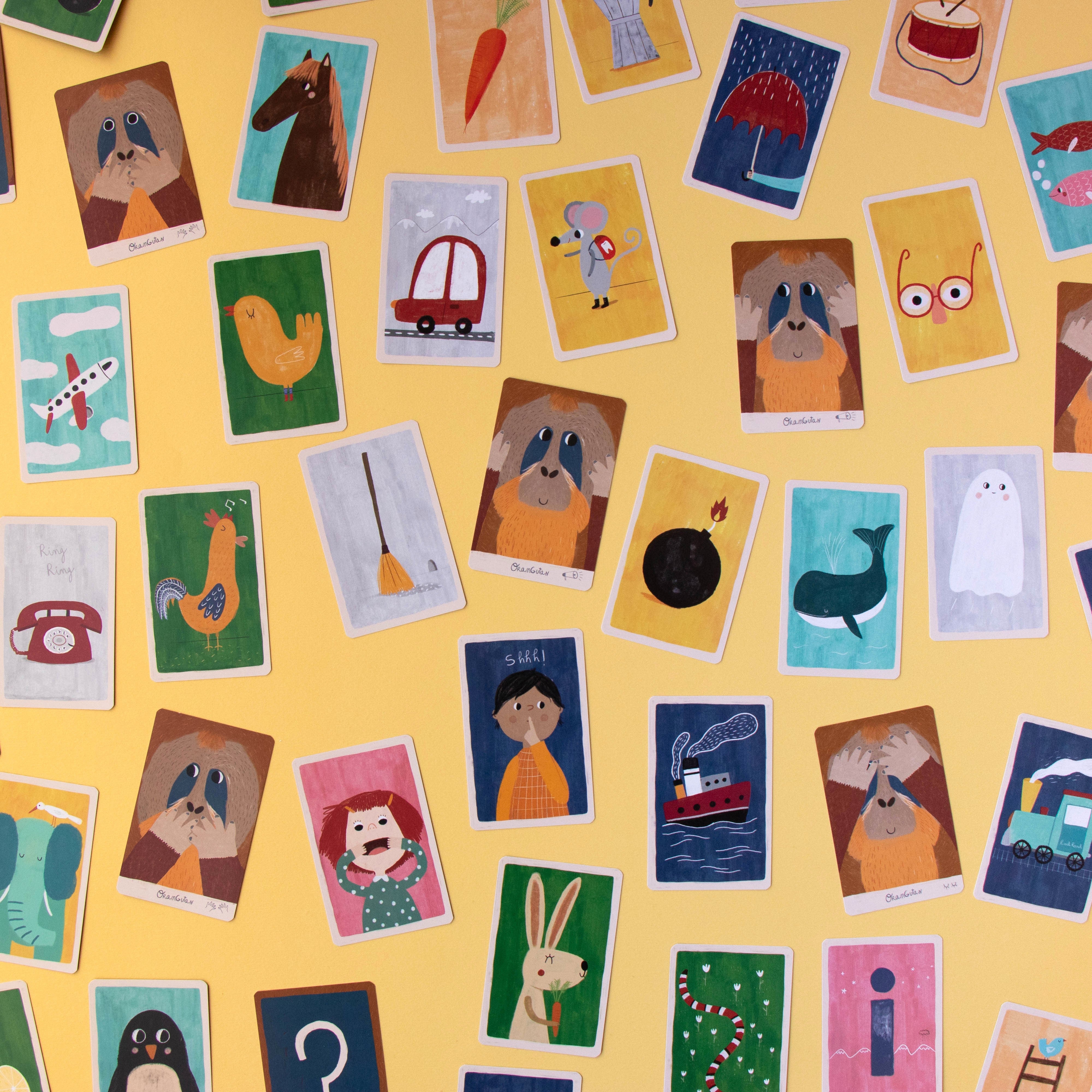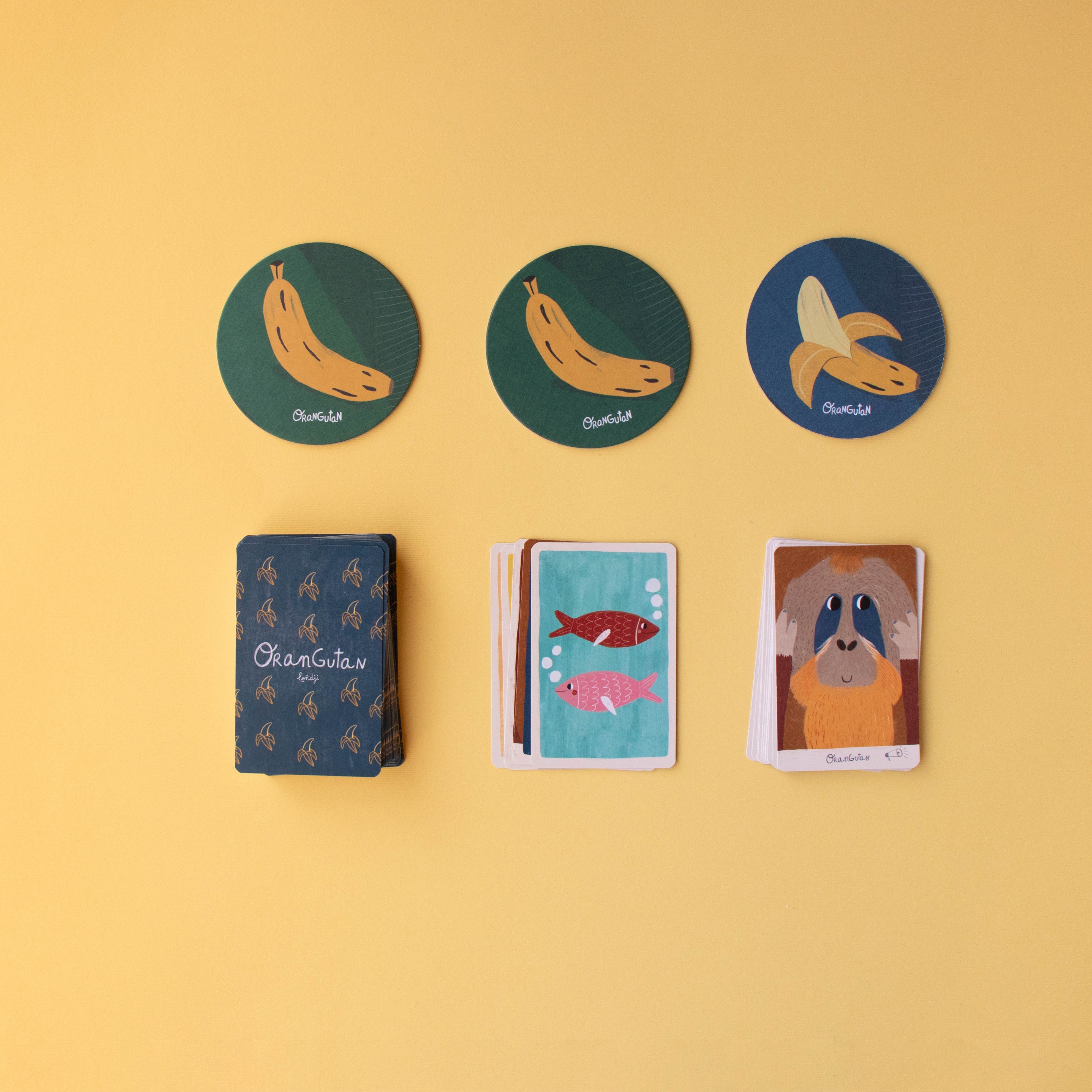 A game where you can remember the sequence of sounds and gestures that are created by all the players from the images on the playing cards. 3 orangutan cards must be obtained before the bananas run out!