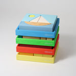 Yellow like summer — bright, warm, and full of energy. Within the frame, the shapes form lively, sun-inspired patterns. Outside the frame, the organic blocks transform into cheerful flower meadows and imaginative landscapes. With large pieces designed for little hands, this set is both a puzzle and an open-ended building toy. Part of Grimm’s Colour Building Sets collection, it gently introduces children to primary and secondary colours and their different effects.