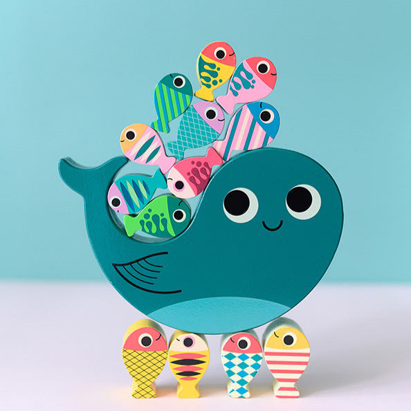 Wooden whale equilibrist game with art by Ingela P Arrhenius. Roll the die. Find the matching colour and balance that piece on the whale. Try not to make it tip!! Includes 18 wooden pieces by VILAC.