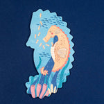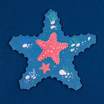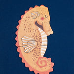 Dive into the ocean depths! Among calm waves and a colorful underwater background live magical sea creatures: the starfish stretching calmly, the seahorse riding the waves, the dolphin jumping joyfully, the shark swimming majestically, the clownfish playing among the corals, and the big whale guiding its way.