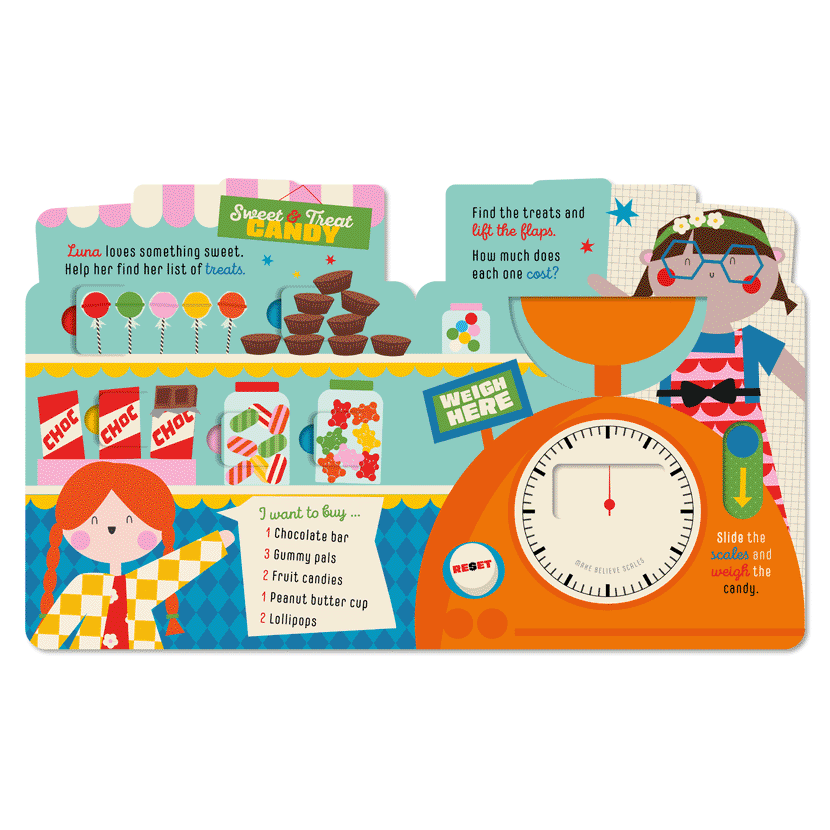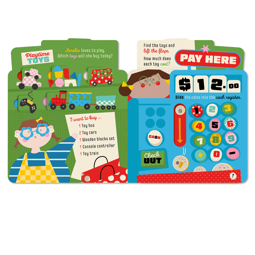 with the flaps and noisy sliders in this cash-register-shaped book.