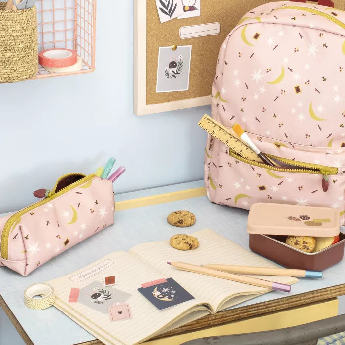 Le sac à dos idéal pour partir à l'école dès 3 ans. On peut y glisser un format A4 sans risque, des petits trésors dans la poche avant ou encore une gourde sur le côté. Fait à partir de polyester recyclé il accompagne les enfants dans leur quotidien.
