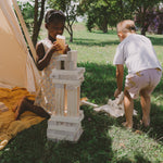 Whatever you do, don't let the tower fall! Stack the Kinderfeets Giant Stackers on top of one another to create a giant tower (each layer should consist of 3 blocks, with each new layer turned 90 degrees from the one below it). Take turns pulling out one block at a time and stacking them back on the top of the tower to create new layers. (Customize the game by creating your own rules using the blocks' engraved numbers 1-18!) Keep playing until one unlucky player knocks the structure down. All players strengthen logical and strategic thinking skills, hand-eye coordination, and problem-solving ability through play!