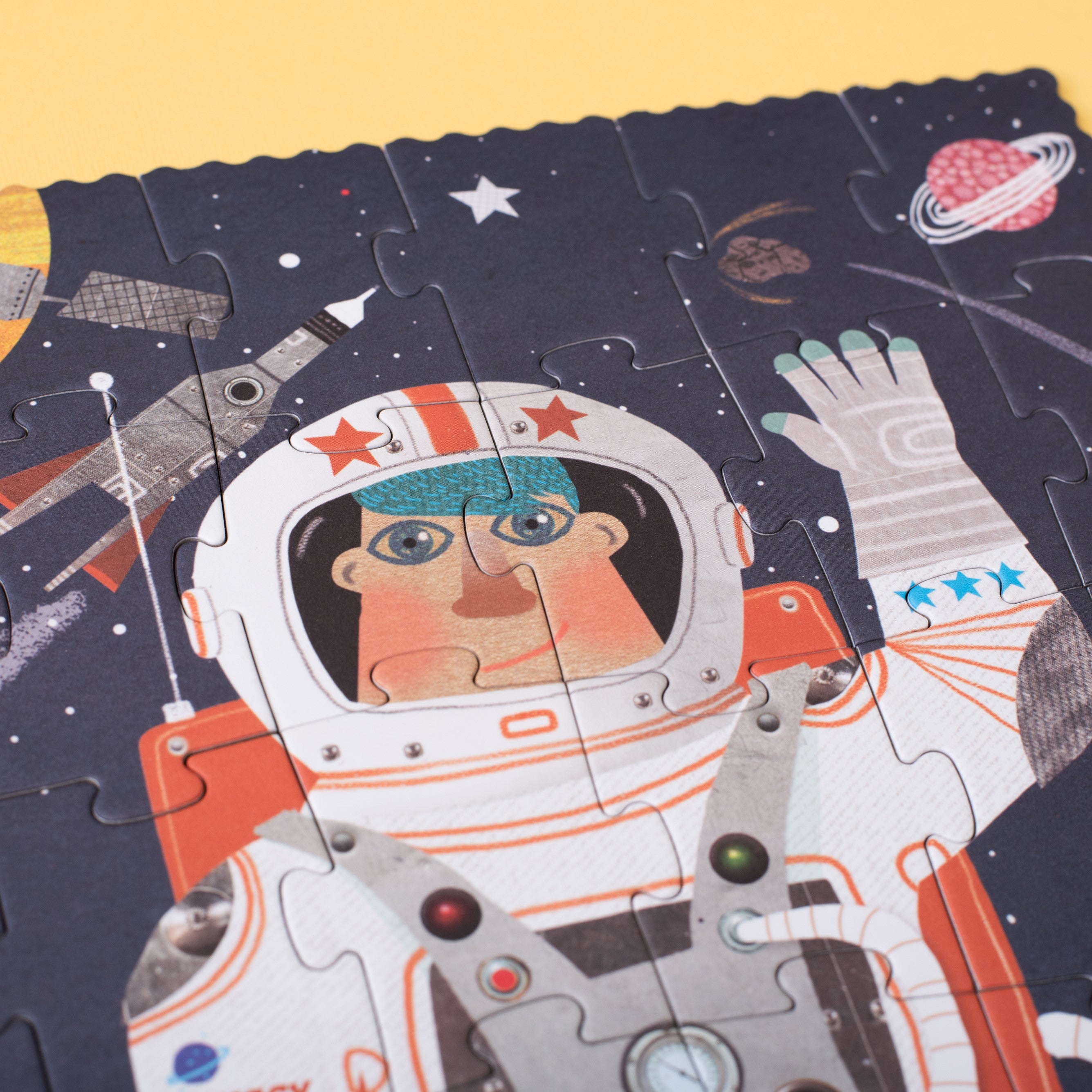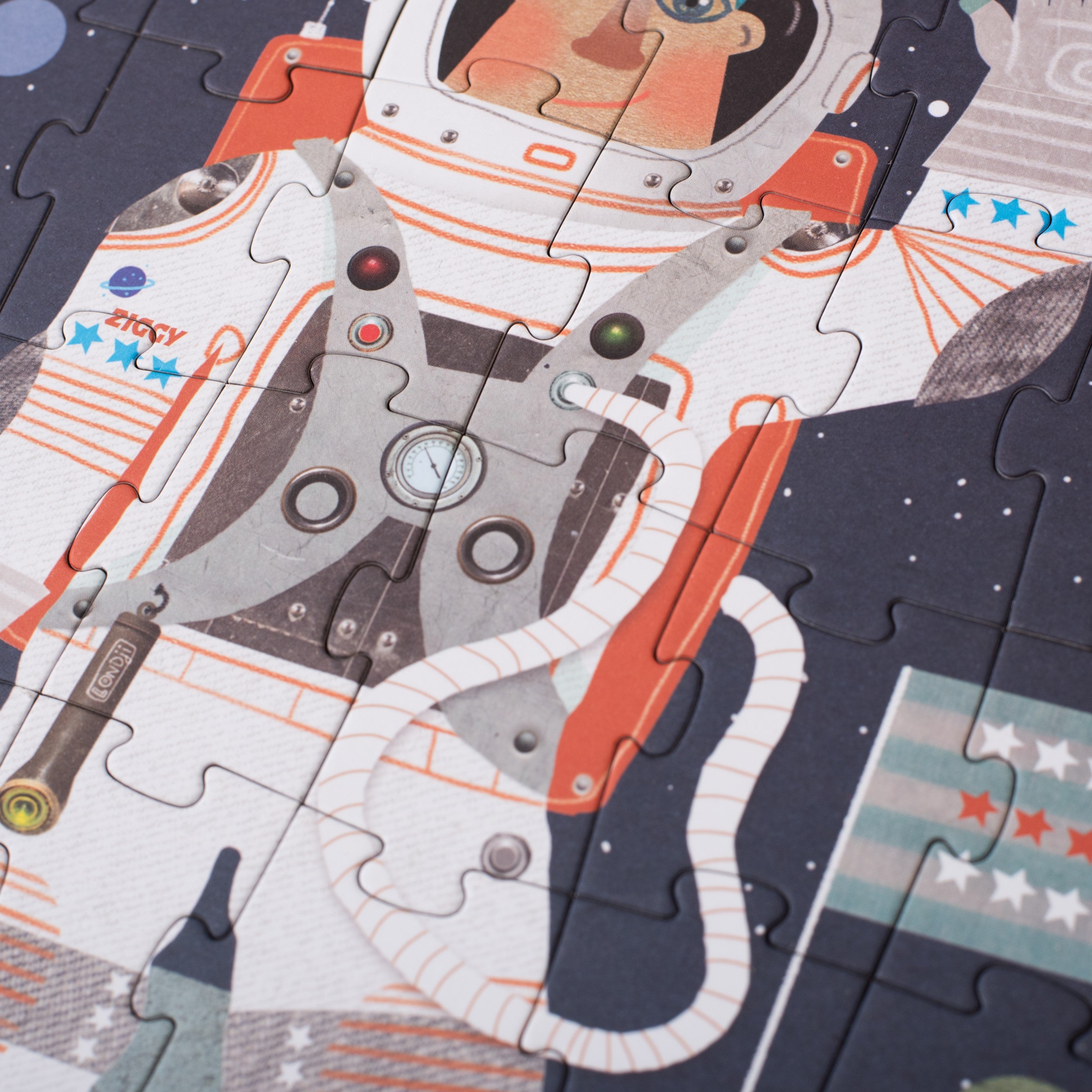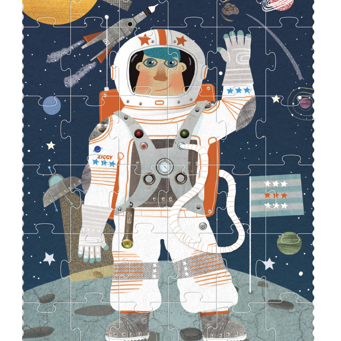 Major Tom has arrived at Londjis moon and is waiting to play with us! 36 piece puzzle made with recycled cardboard and FSC paper. Packaged in sturdy cardboard box. For ages 3-6.