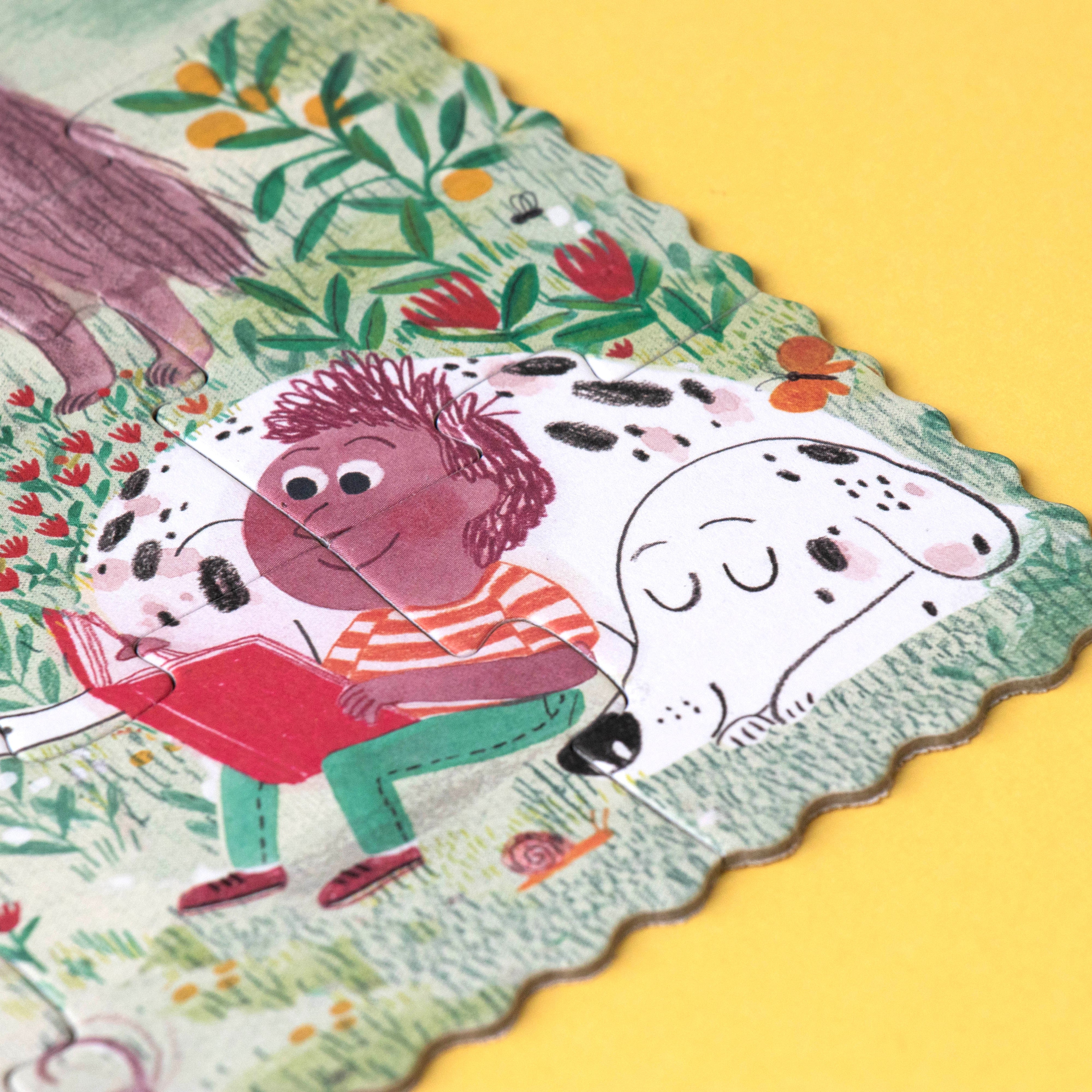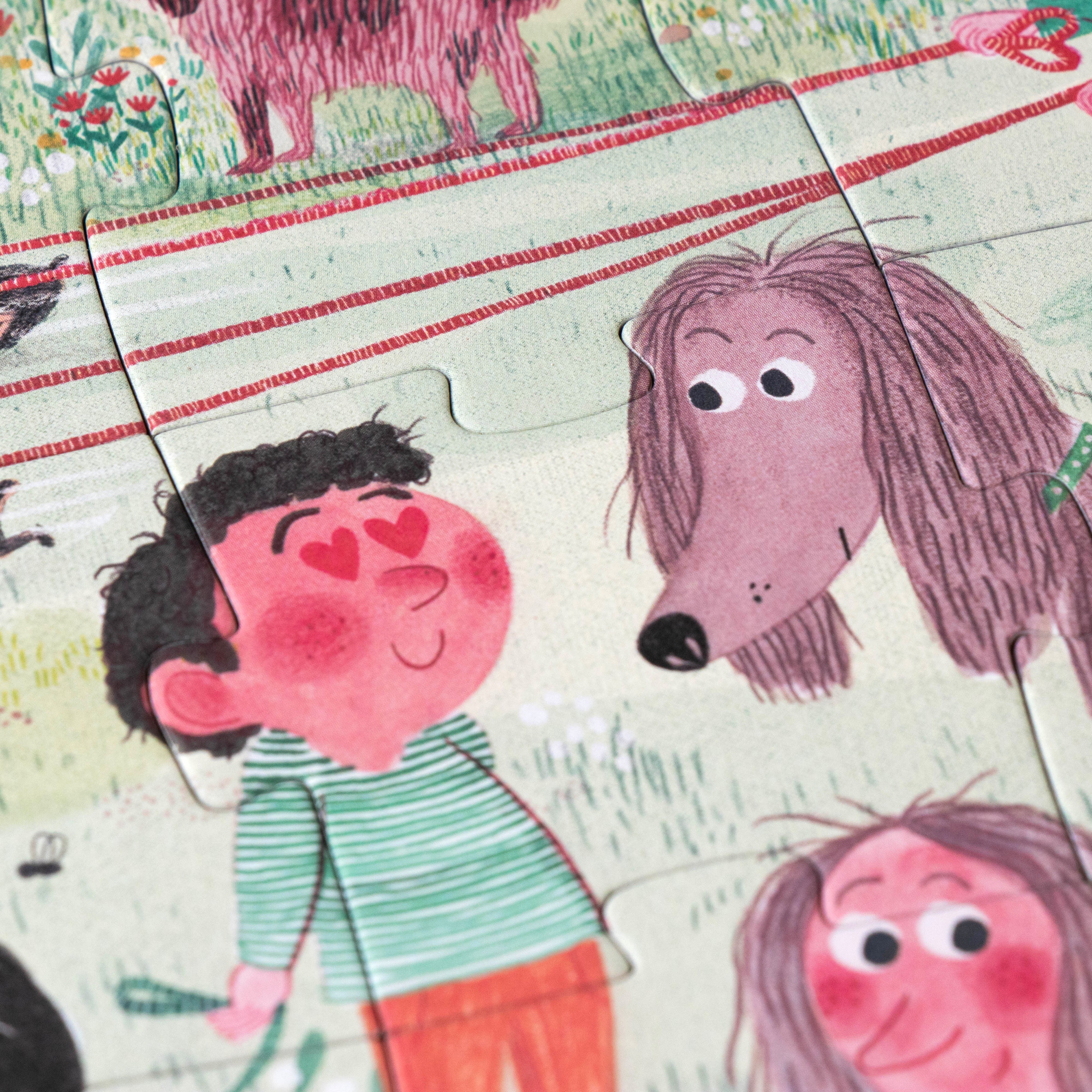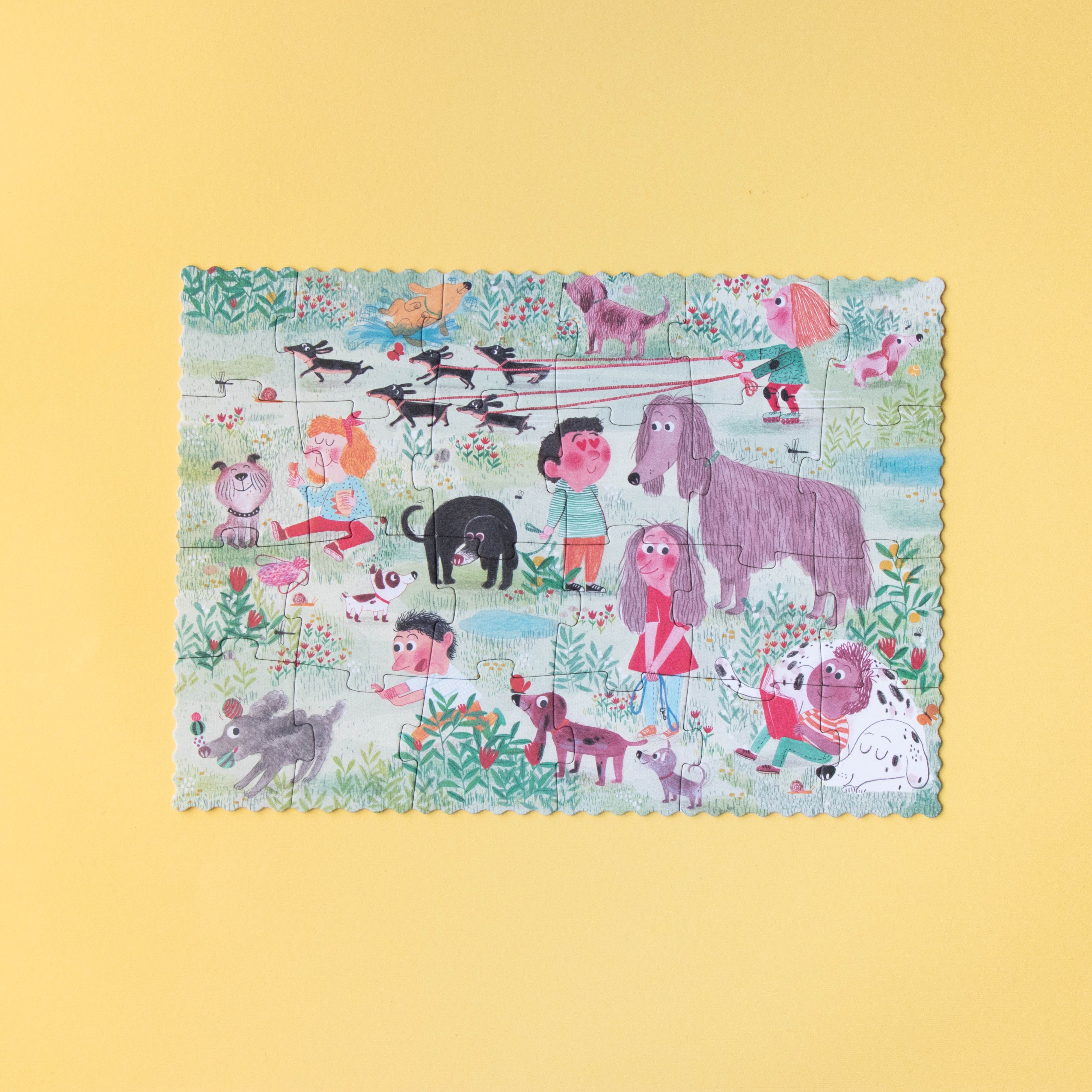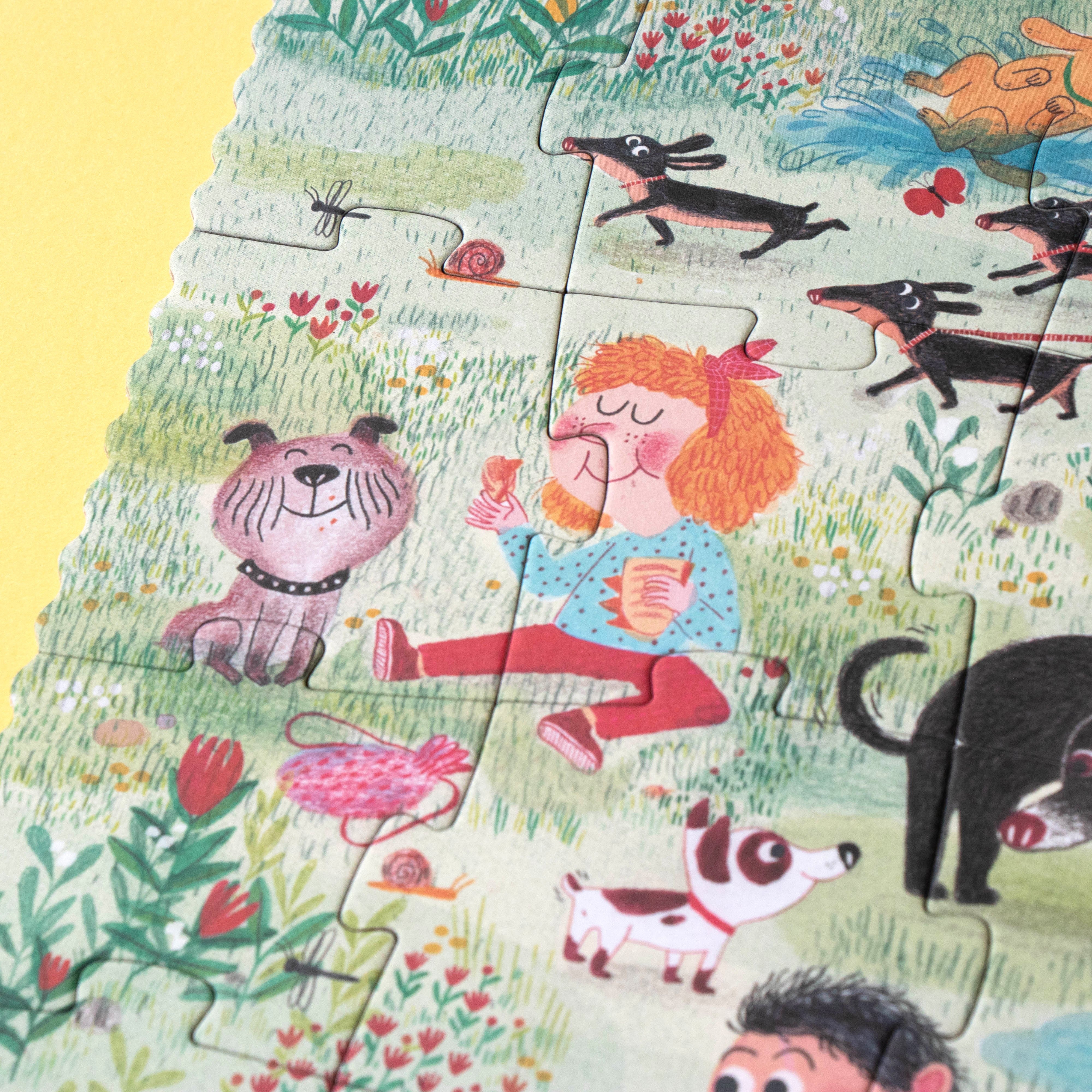 Cats & Dogs Reversible Pocket Puzzle made in Barcelona. Includes 24 reversible pieces with illustrations by Marta Altes.