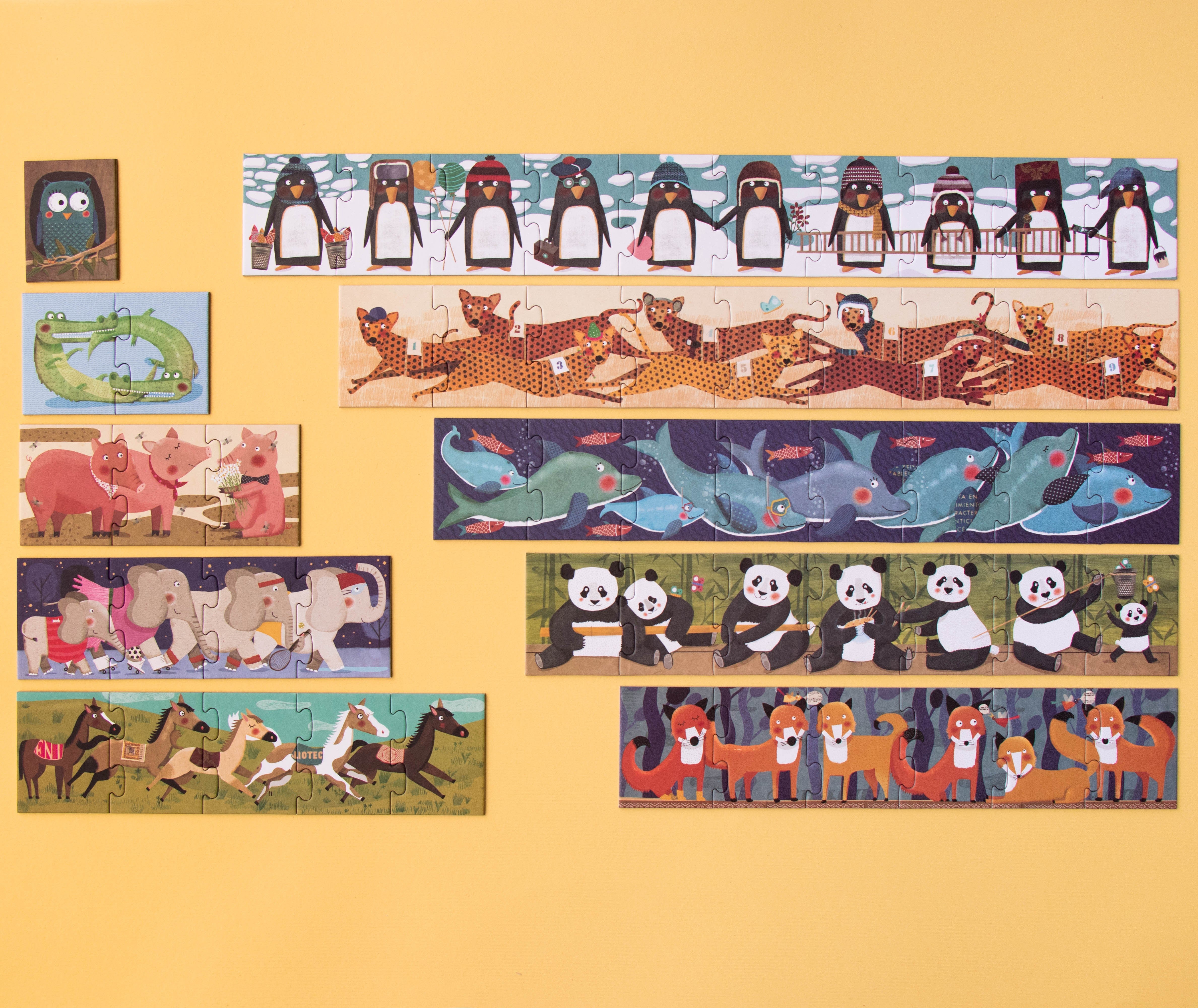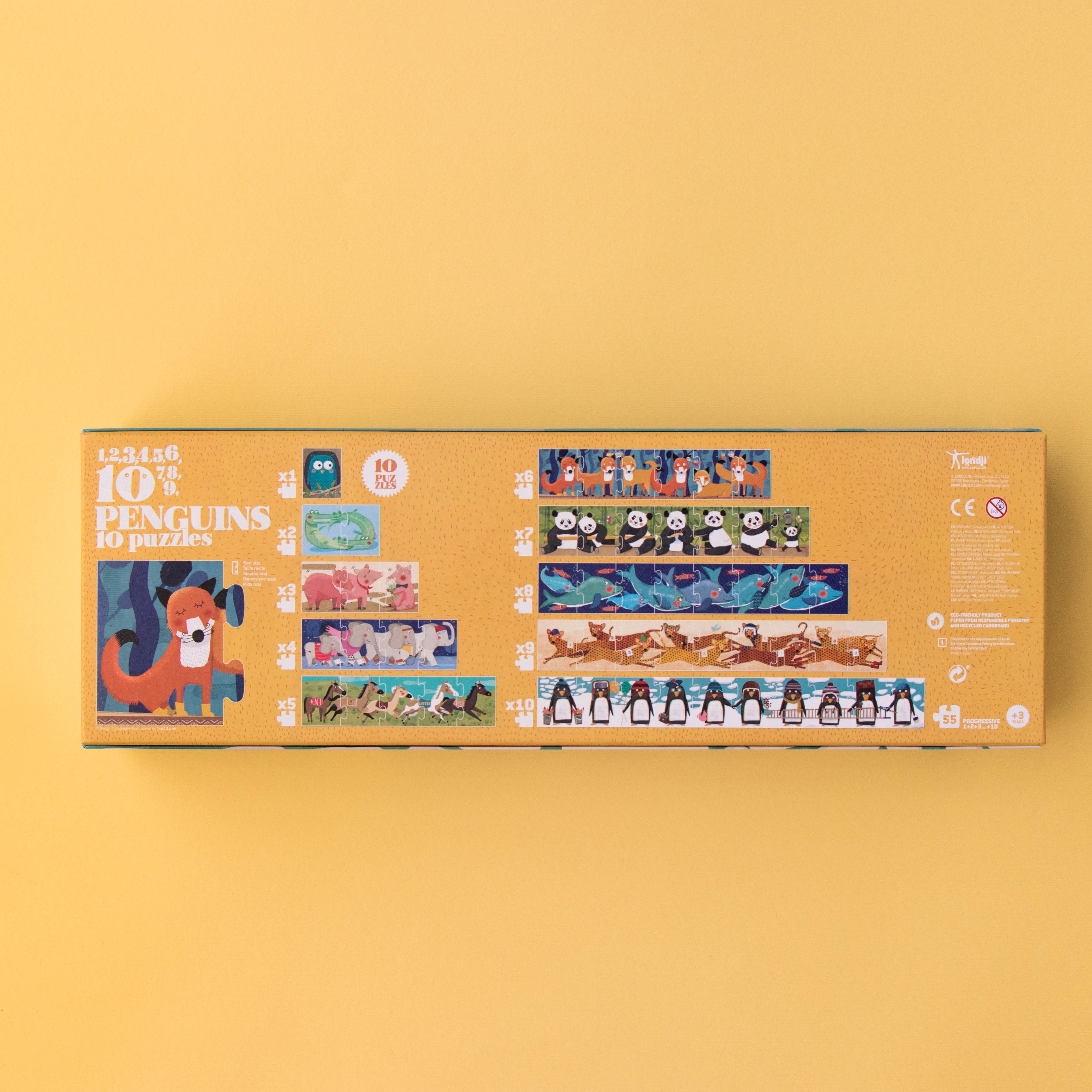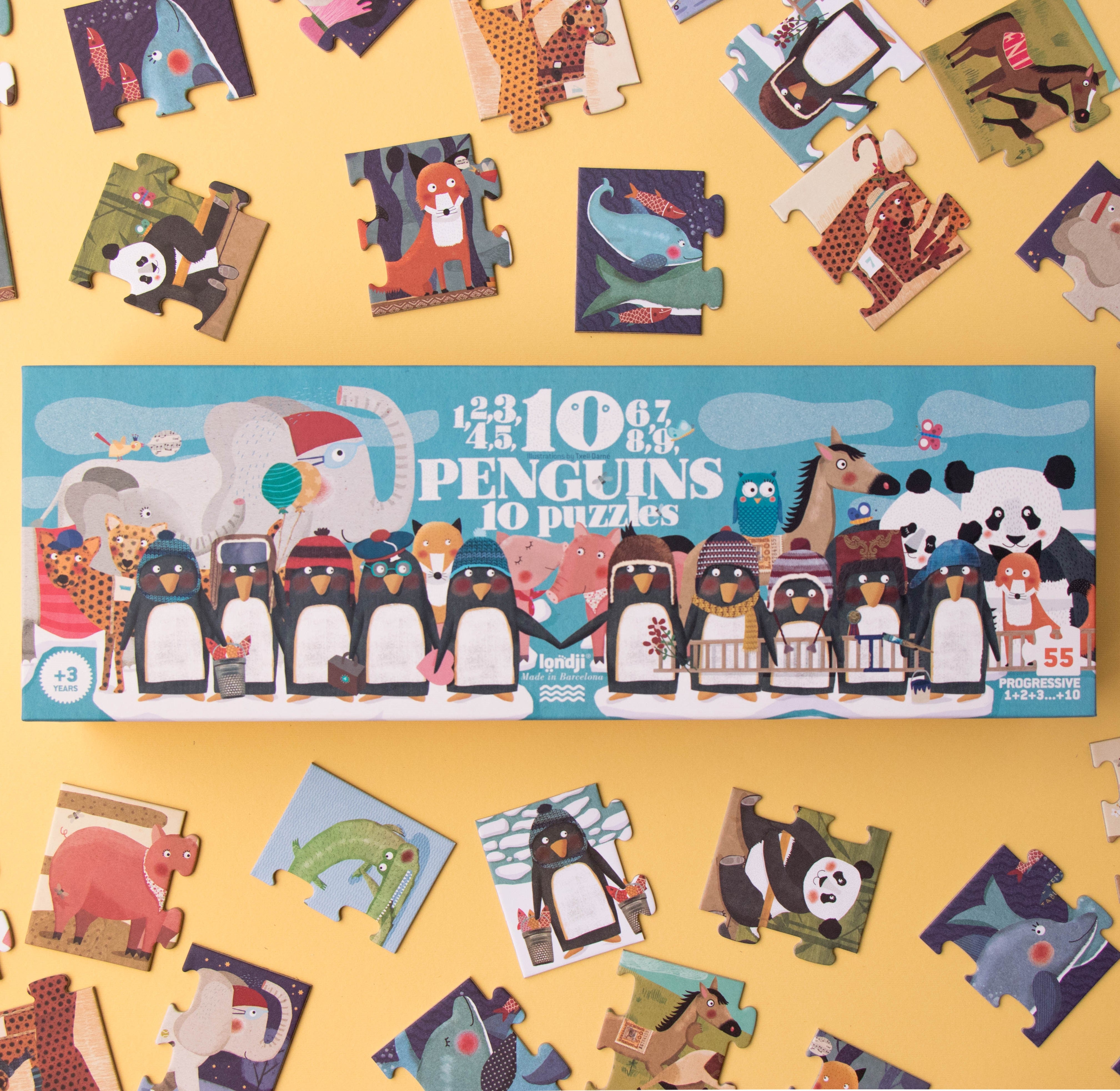 55 piece progressive puzzles by Londji includes 1 Owl, 1 crocodile, 3 little pigs, 5 horses... and finally you achieve the 10 penguins! 10 progressive puzzles to learn in a fun way how to count.