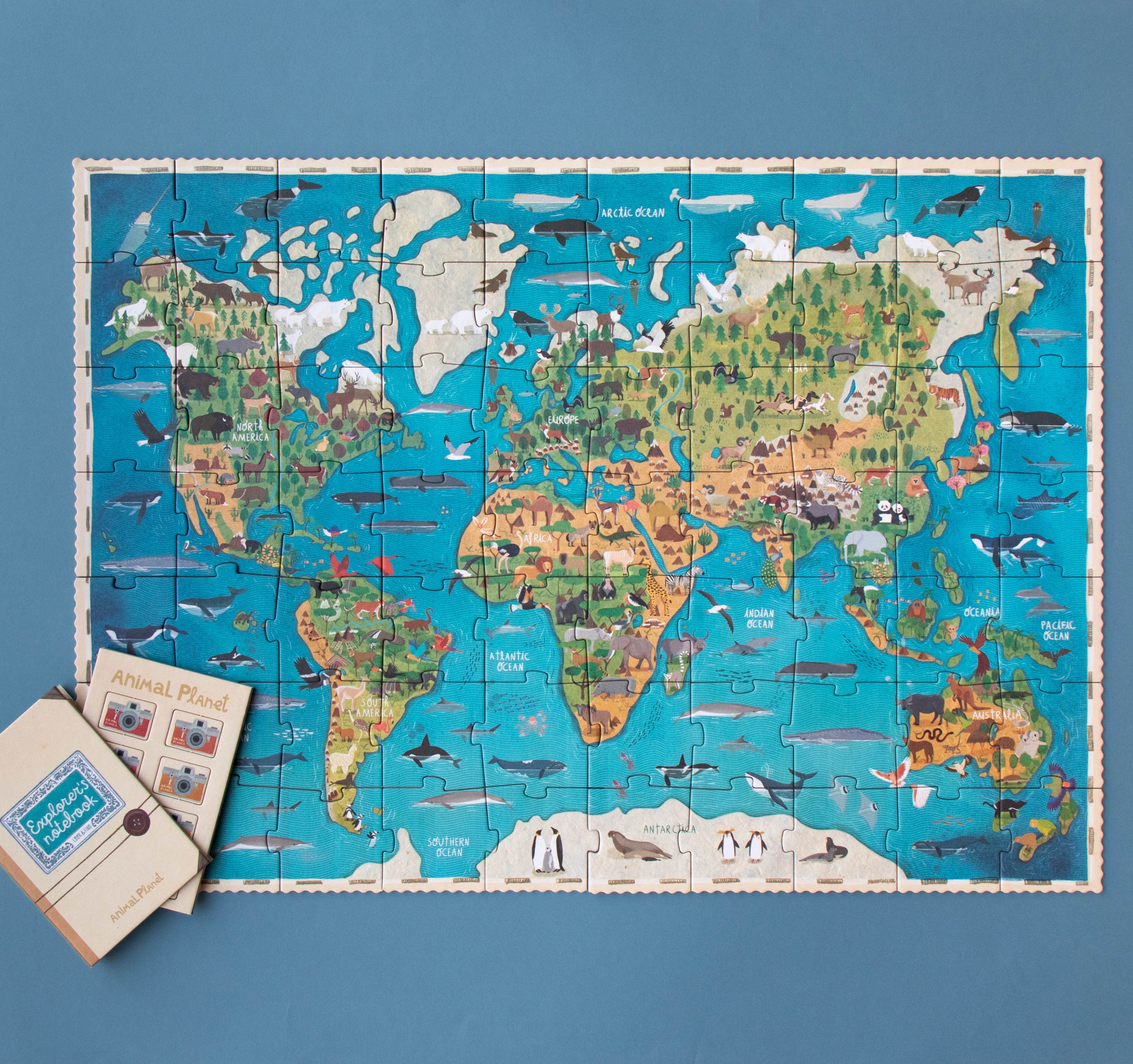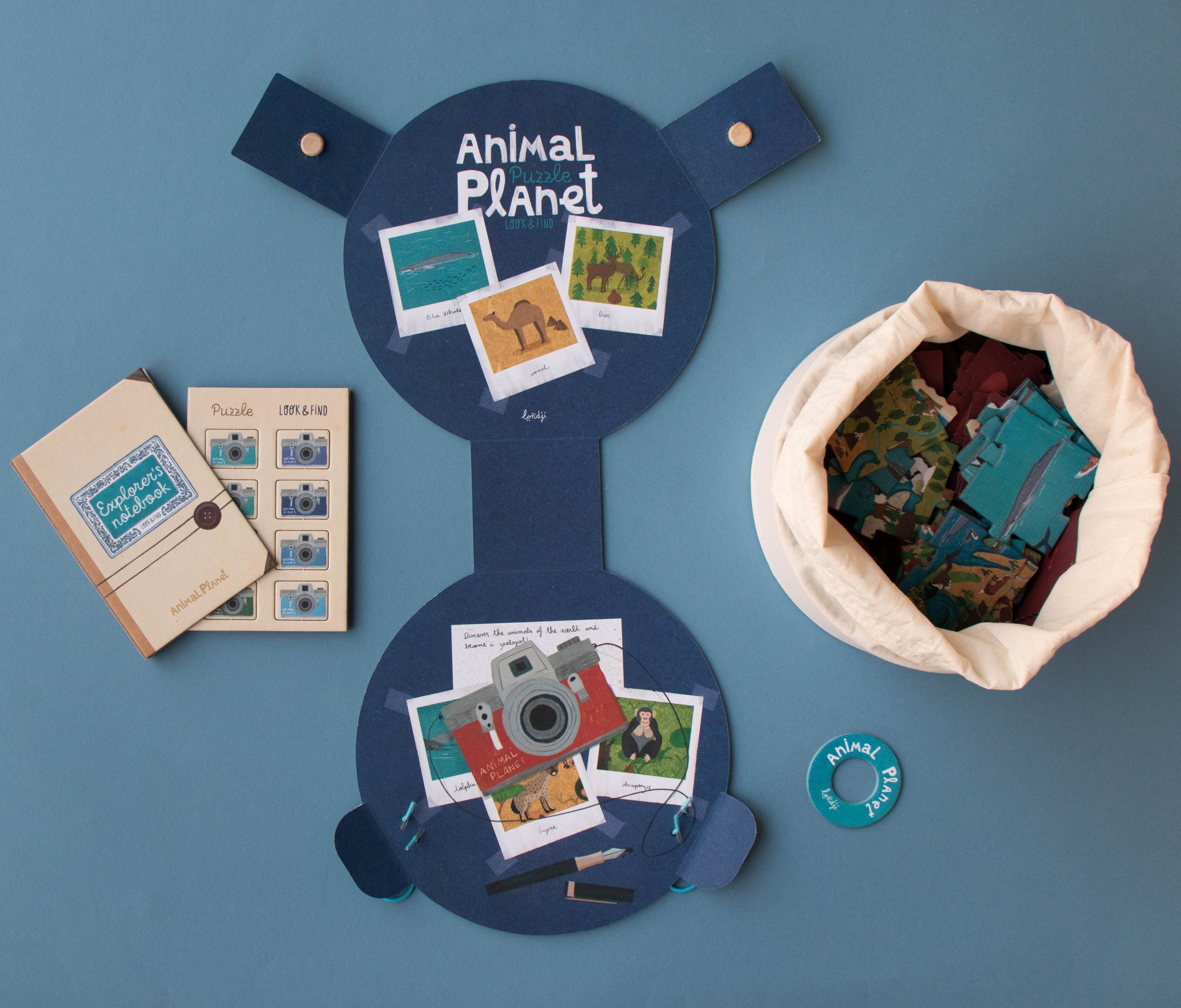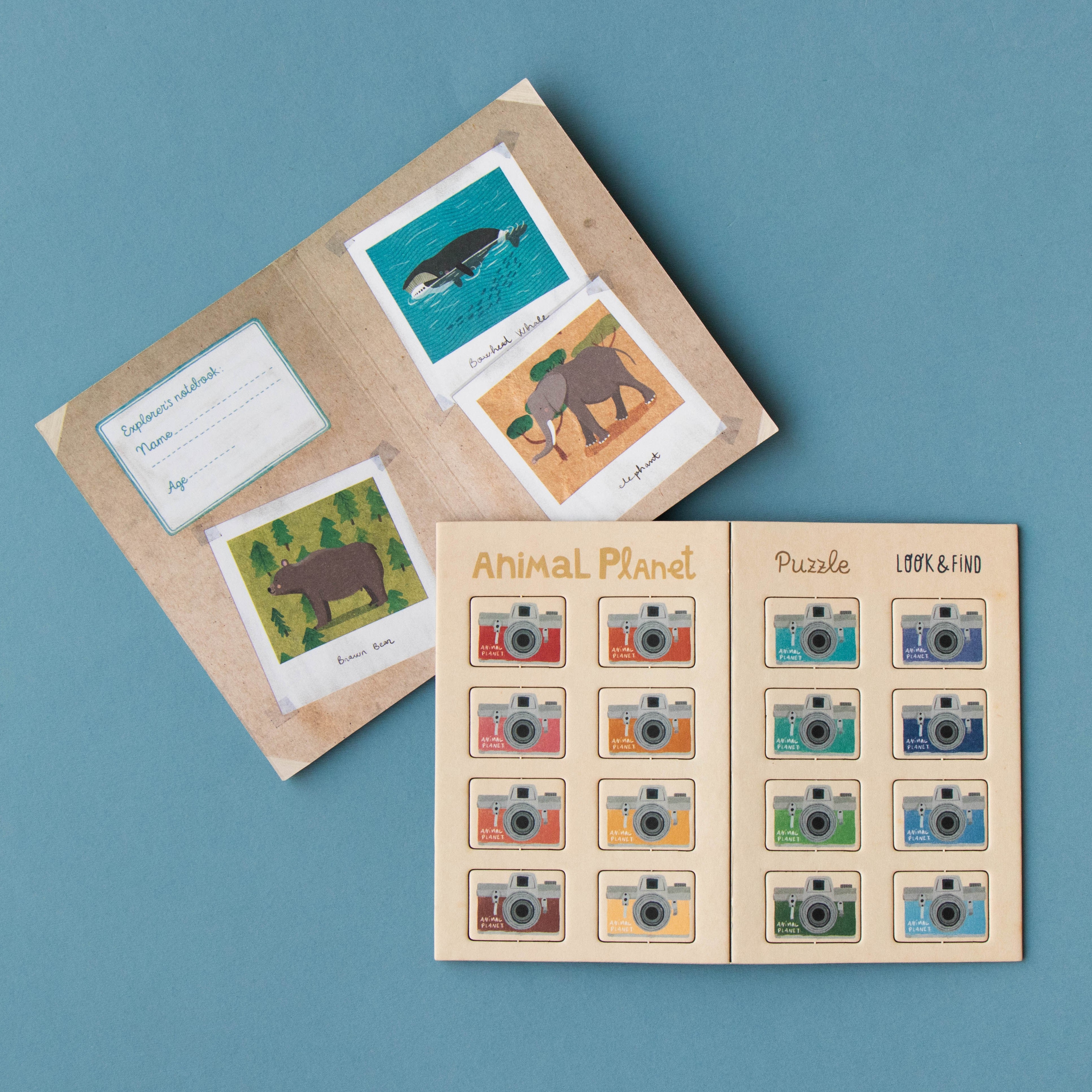 Animal Planet look and find puzzle. Discovery the animals of the world and become a zoologist! Assemble the puzzle and find the animals from the explorer's notebook. Includes 70 puzzle pieces, an explorer's notebook, 16 observation activities and 16 camera cards. For ages 5 to 8 years old. Illustrations by Txell Darne. Completed puzzle measures 67 x 48cm. Box measures approximately 24 x 24 x 8 cm.