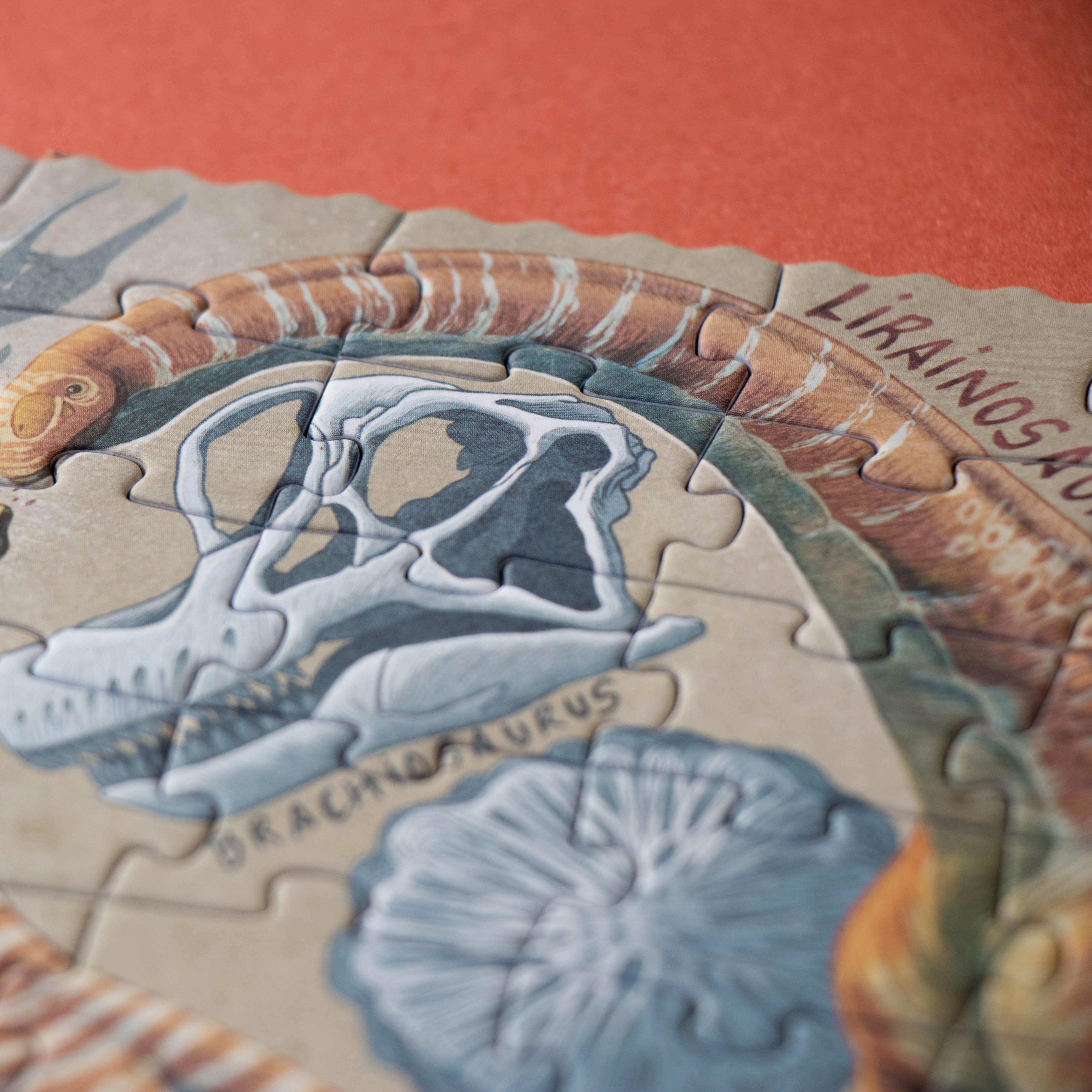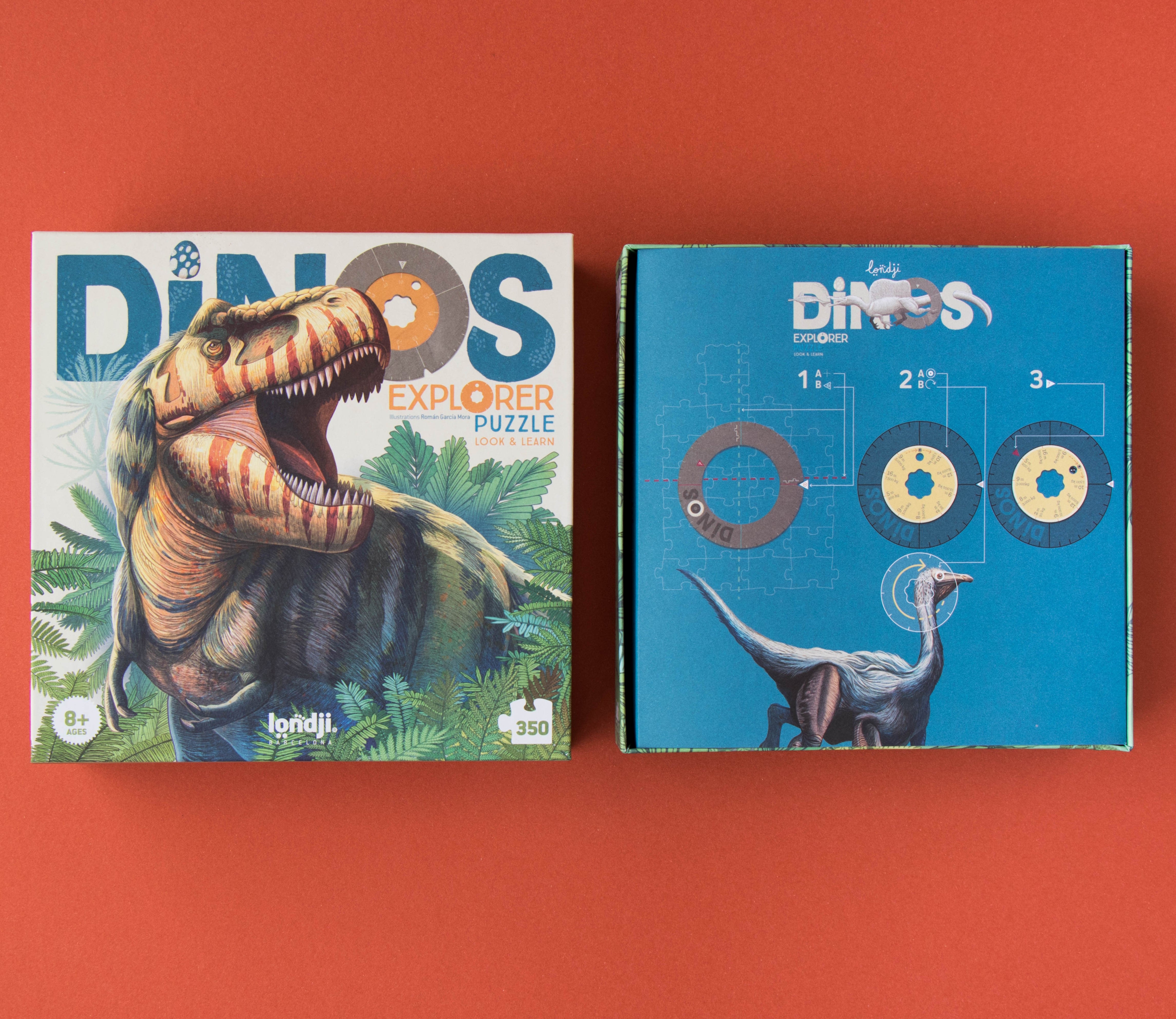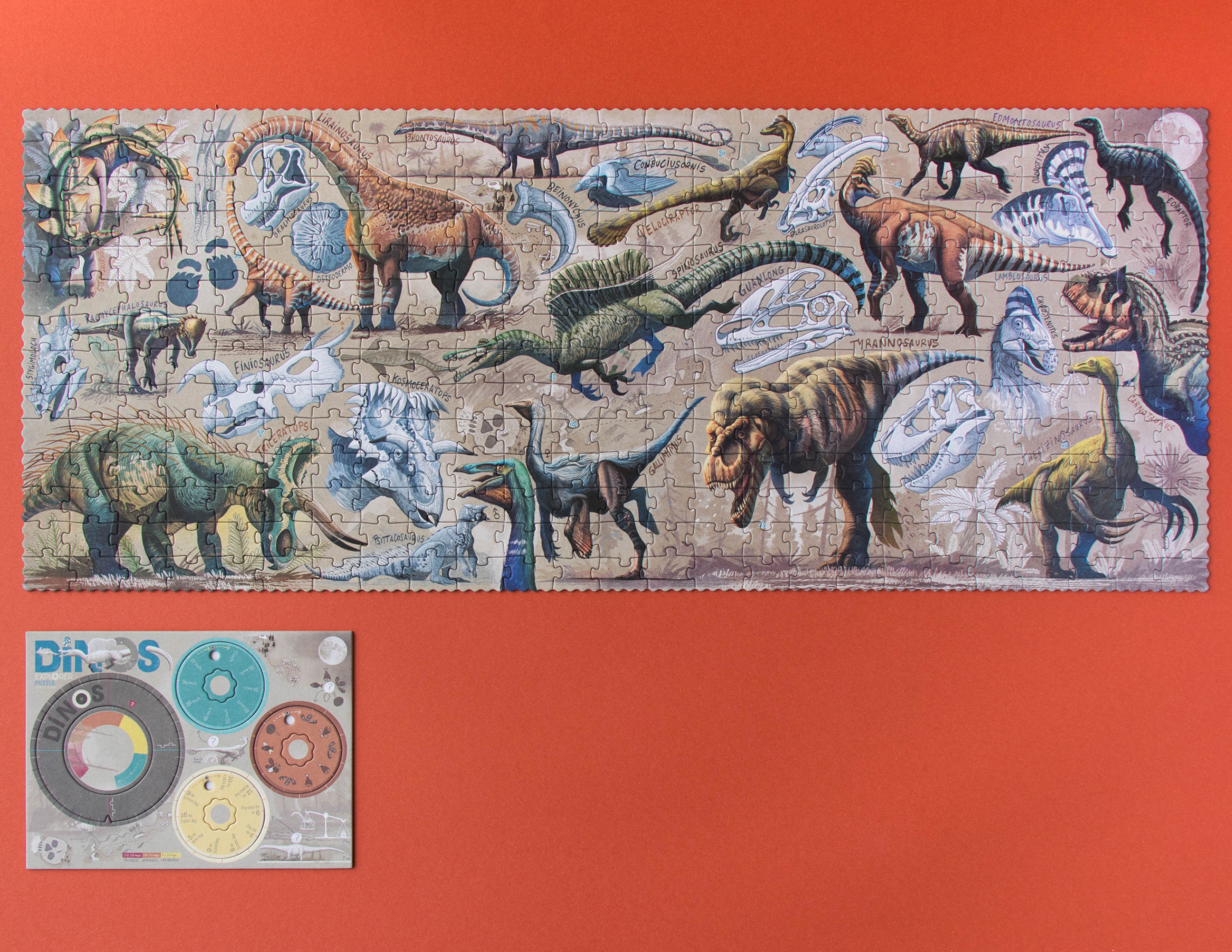 The puzzle is complemented with cardboard wheels that, once fixed on the dinosaur, will give us more information about each of the species incl approx height, weight, speed of travel and diet.