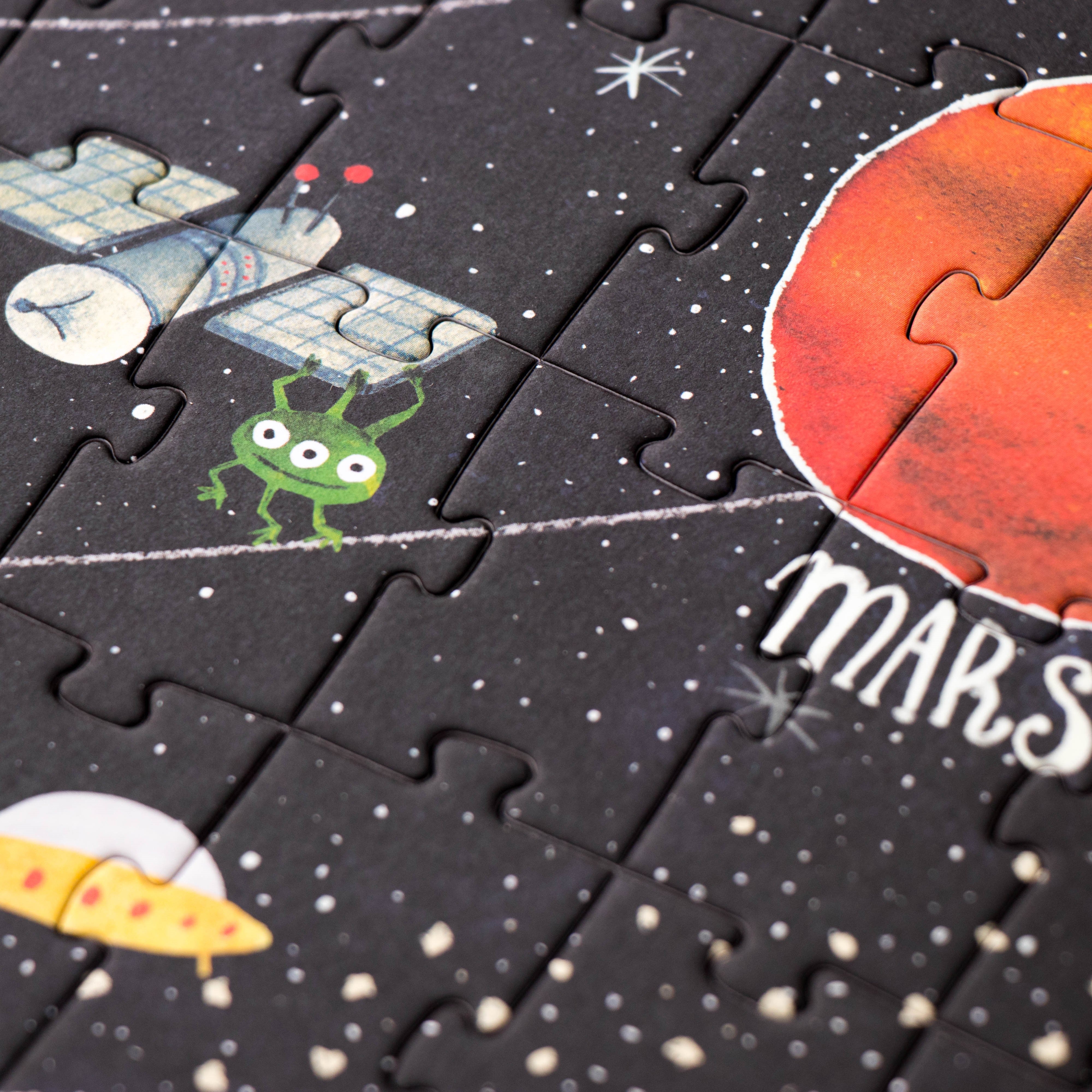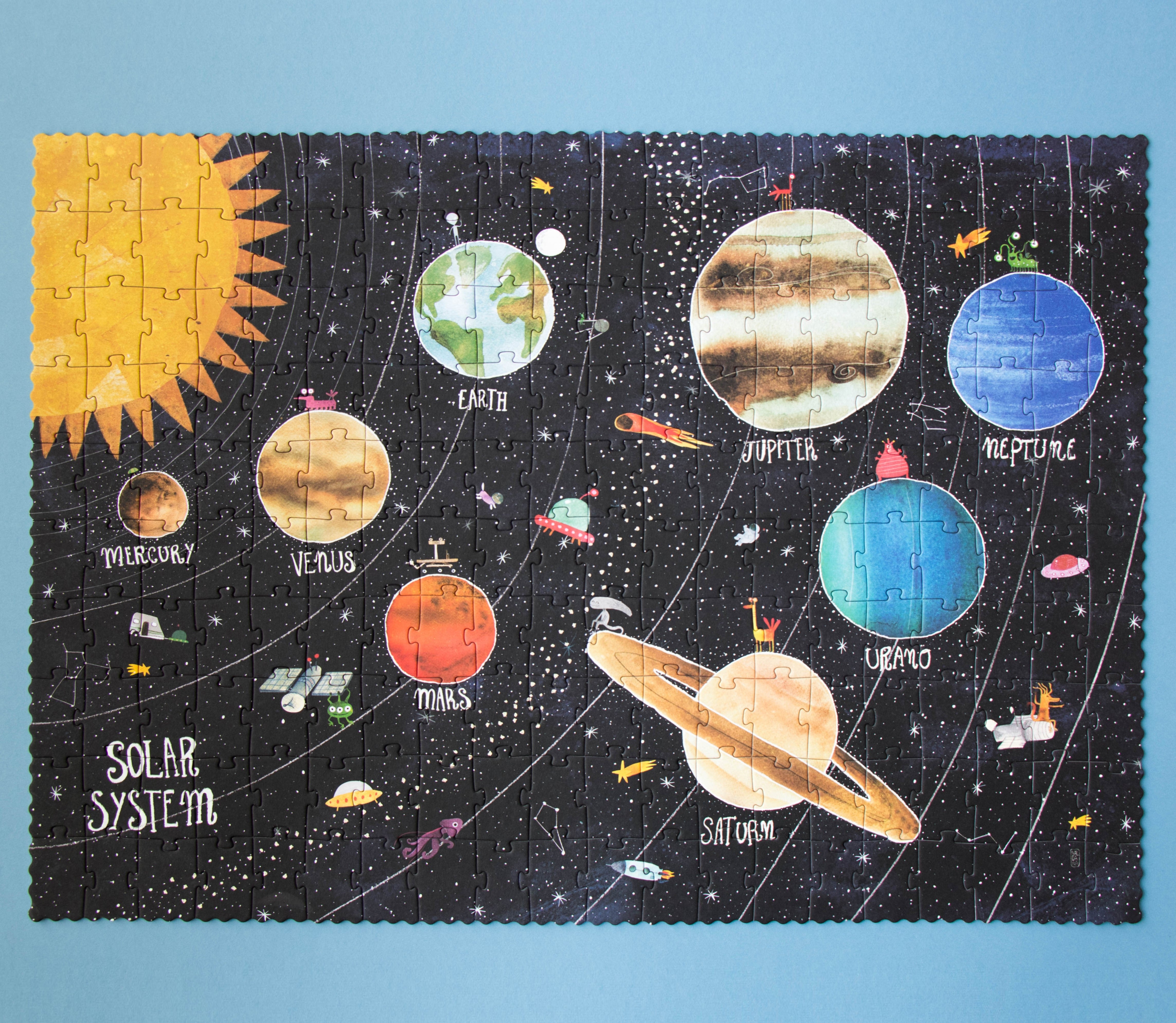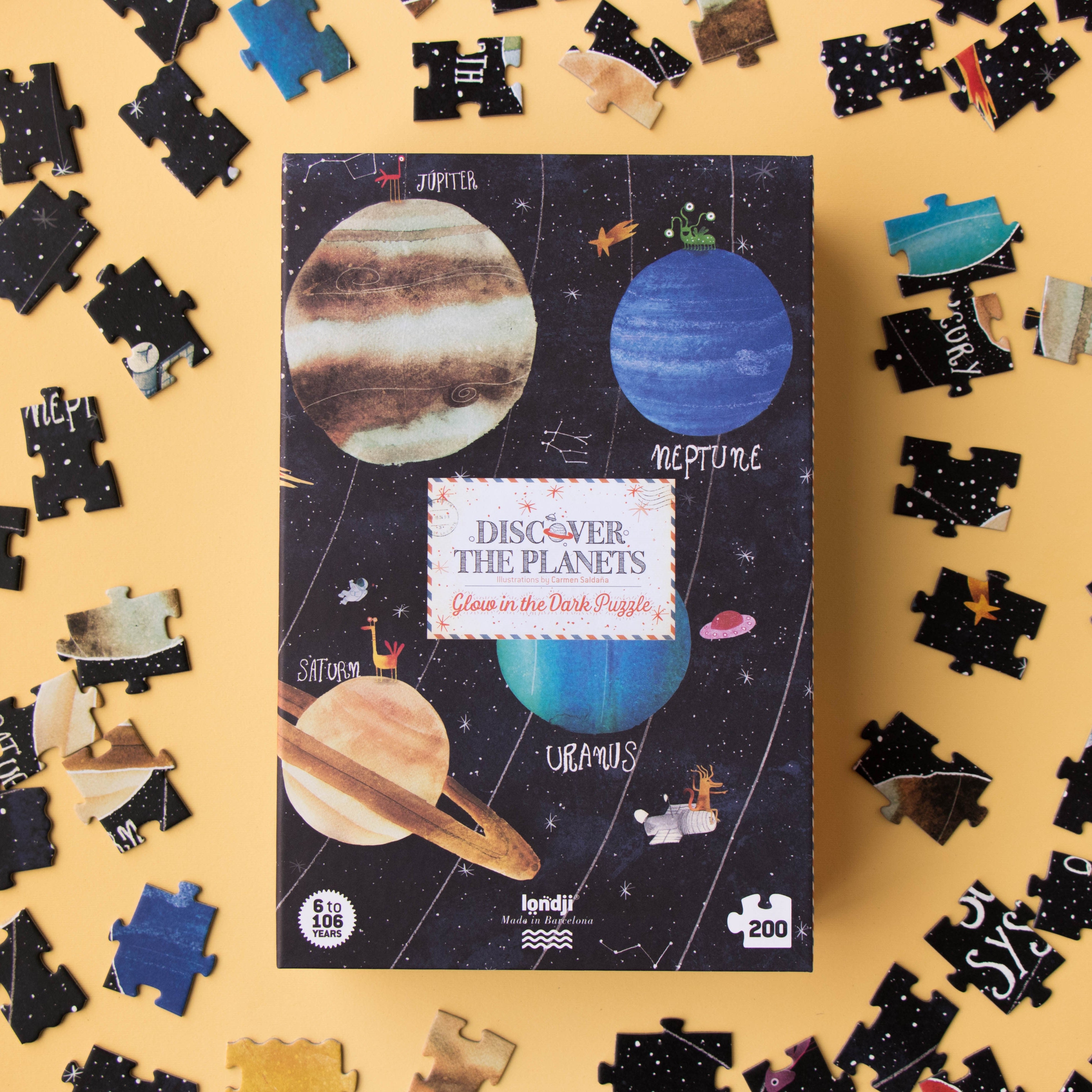 Discover the Planets 200 piece glow-in-the-dark puzzle made in Barcelona by Londji. Puzzle features all planets in our solar system and when the lights are turned out, features constellations that glow!!