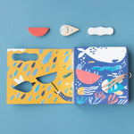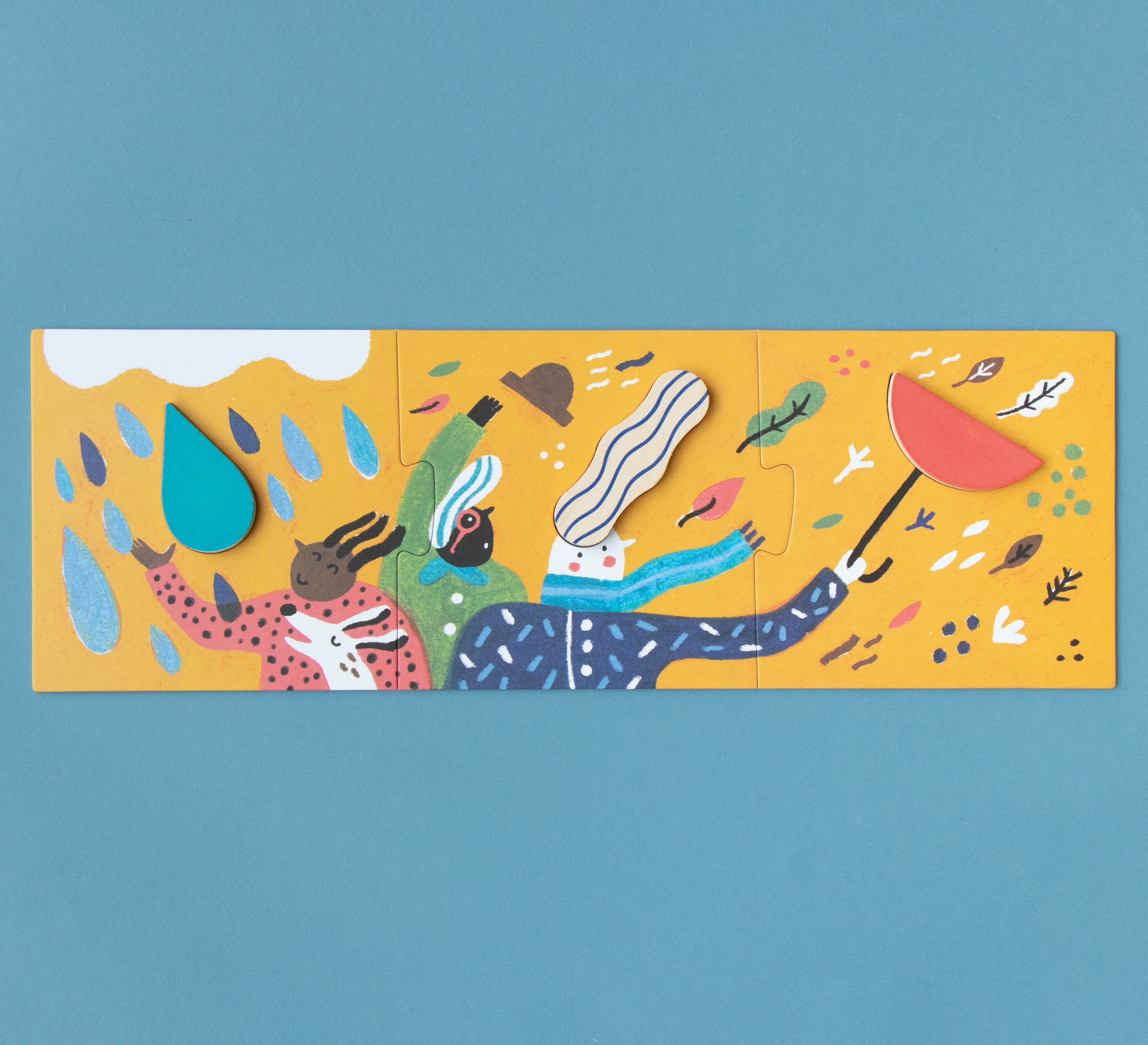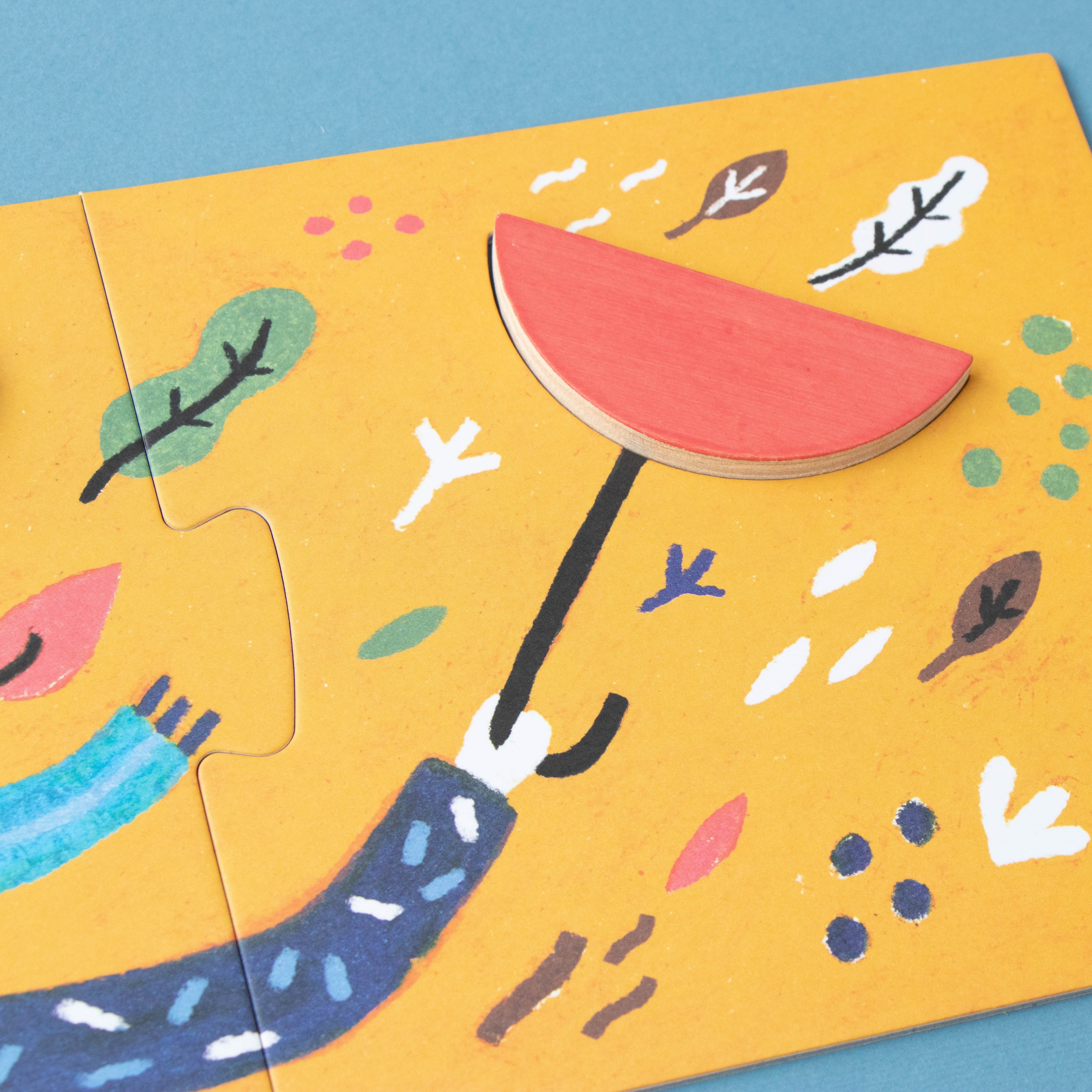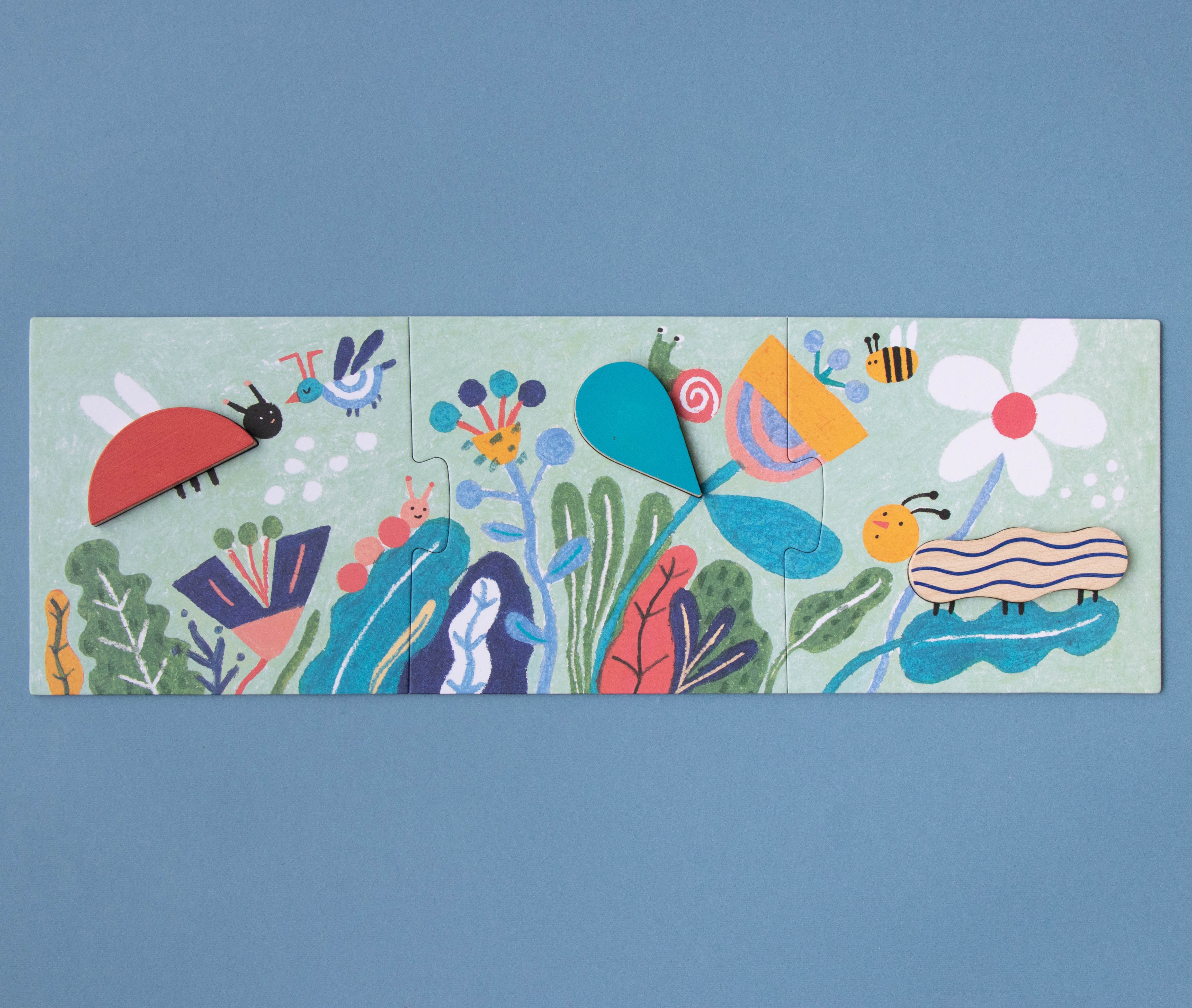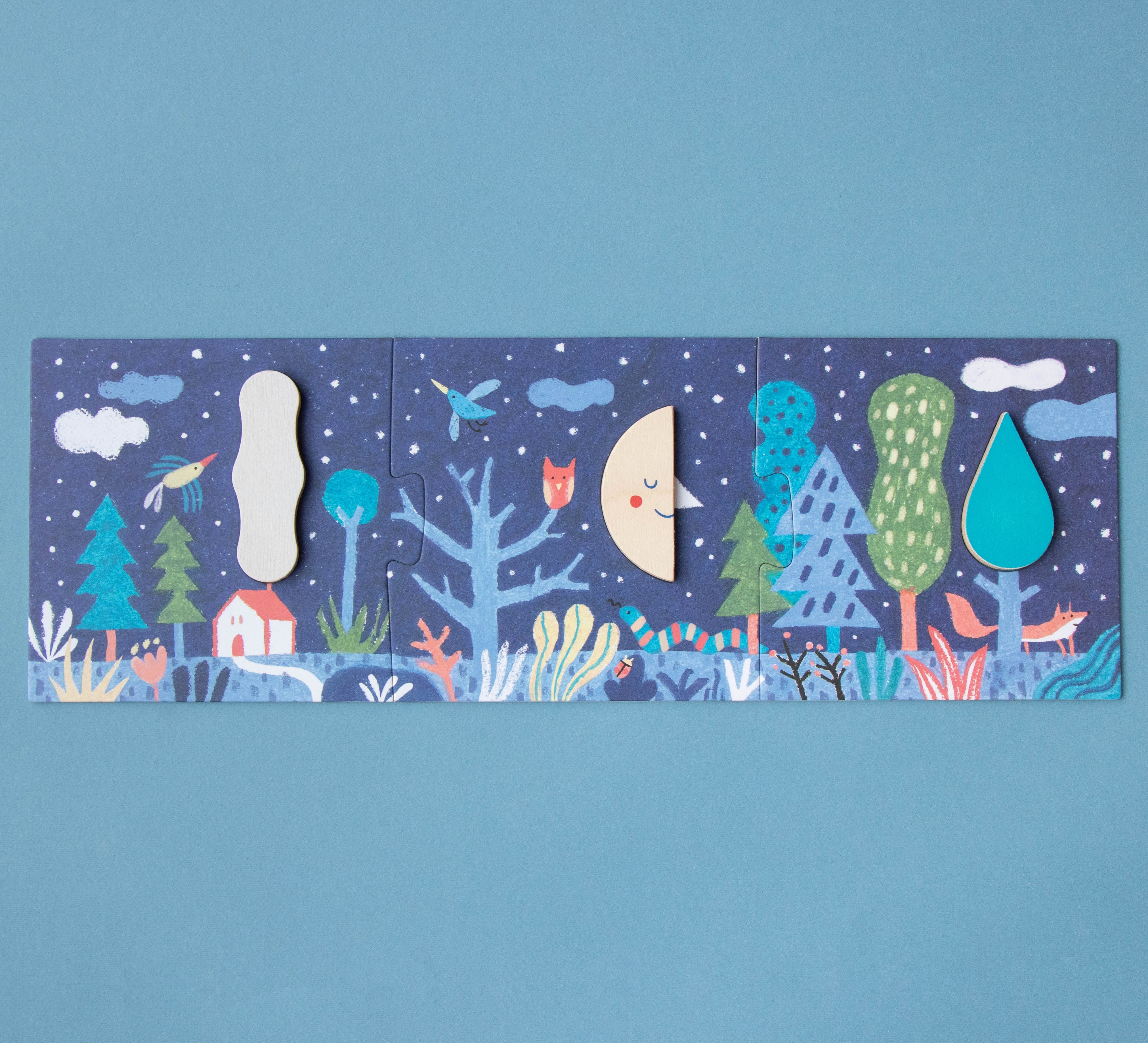 This puzzle is made in Barcelona and has illustrations by Queralt Armengol. Includes four, three piece puzzles and wooden inserts. Recommended for ages 2+. Box measures approximately 18 x 19 x 4.8 cm and is made from recycled cardboard and paper.