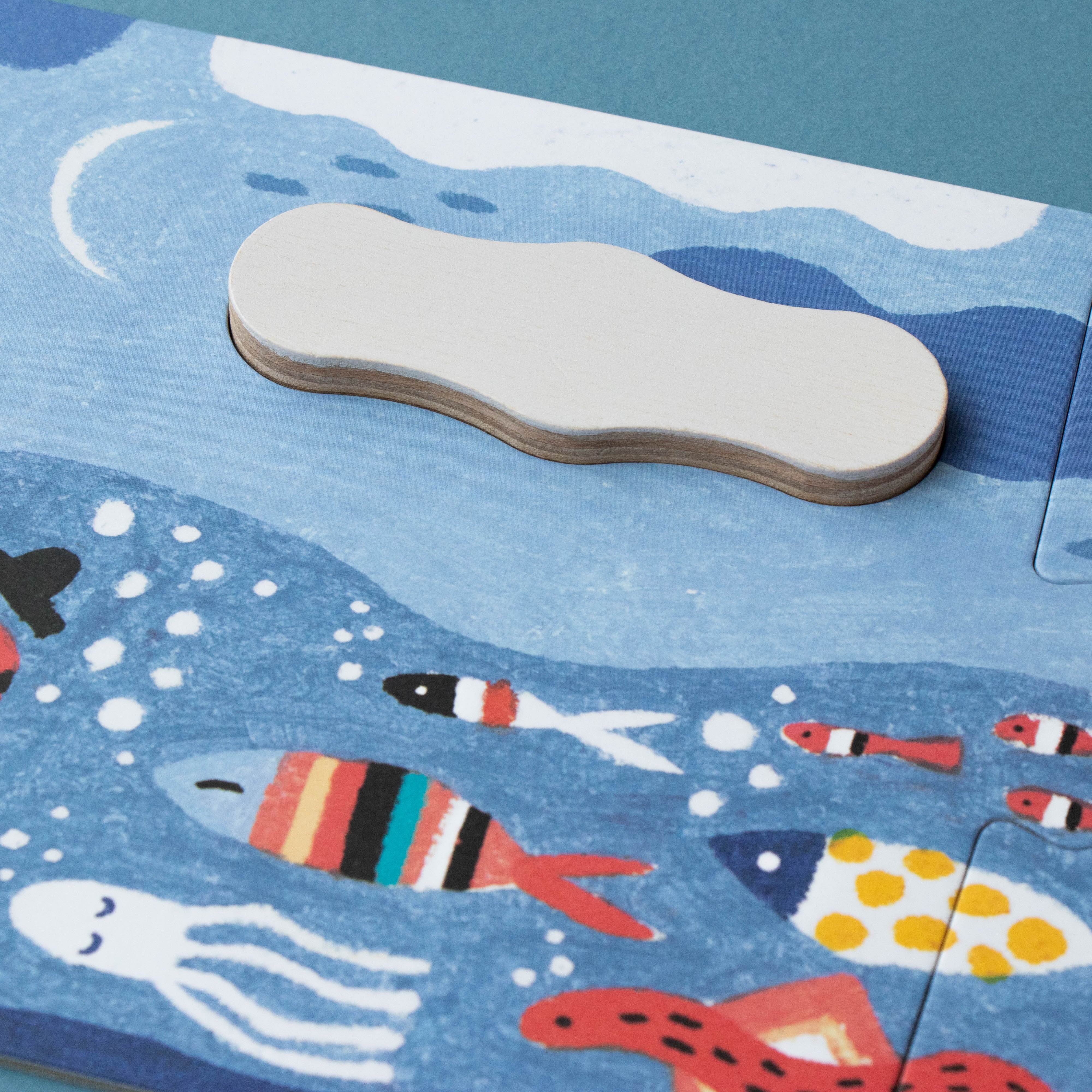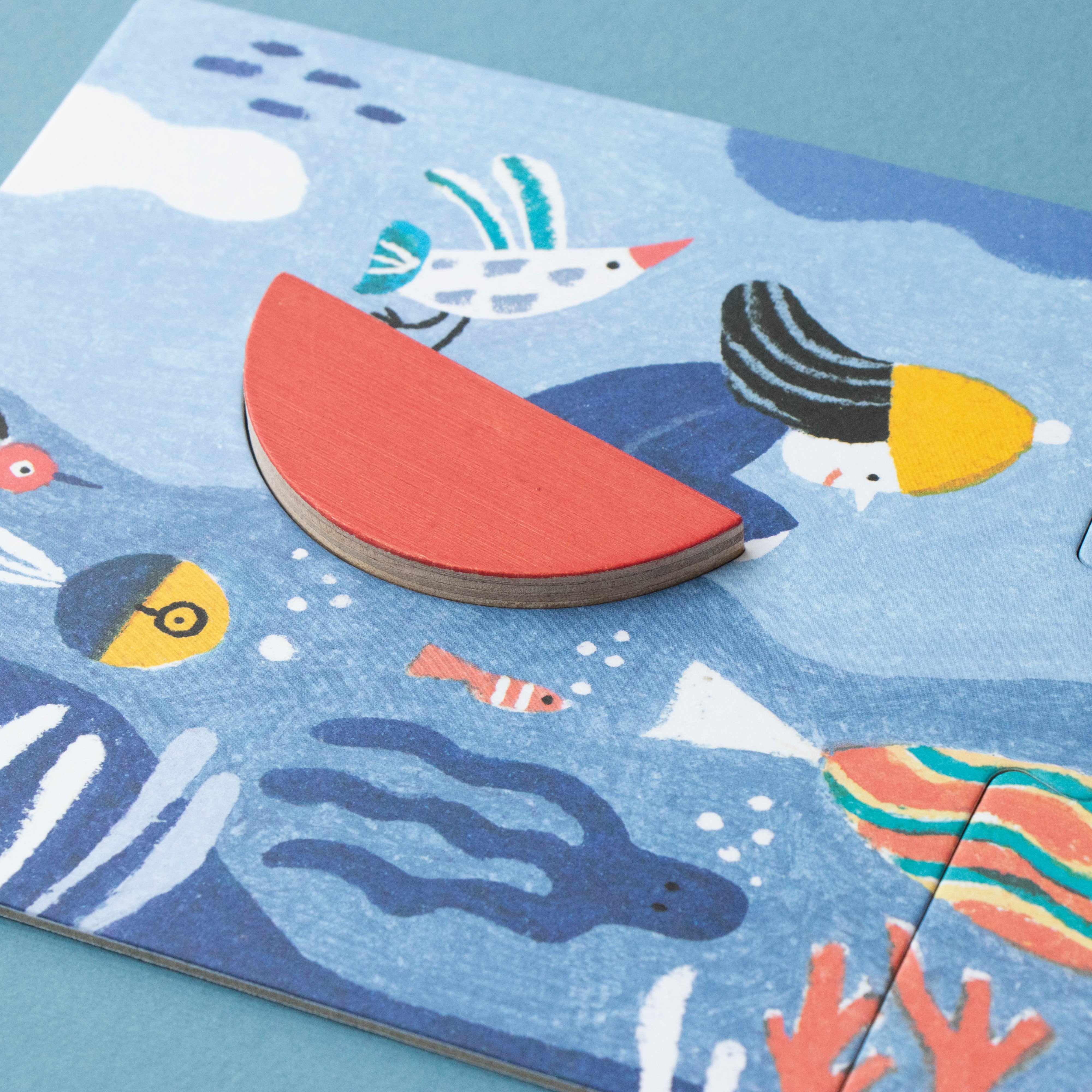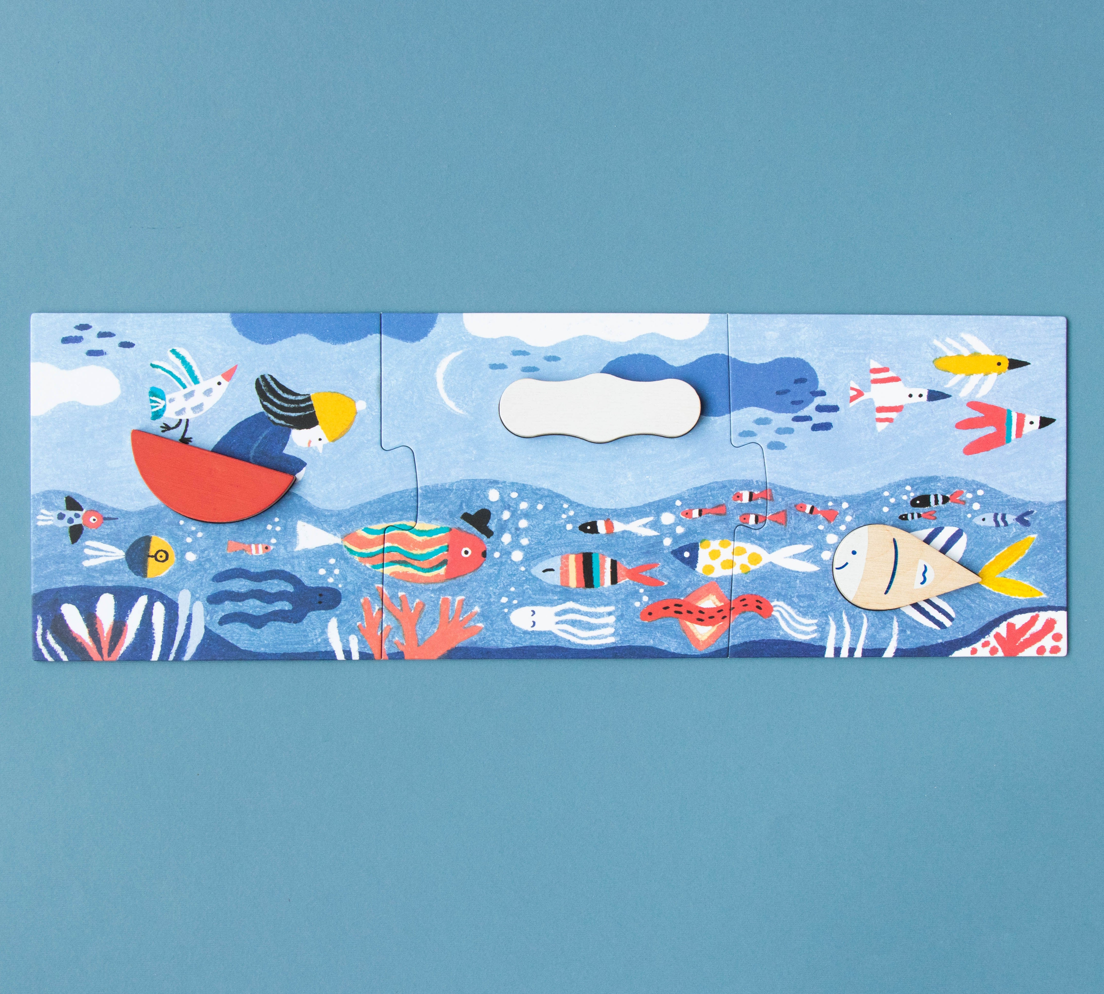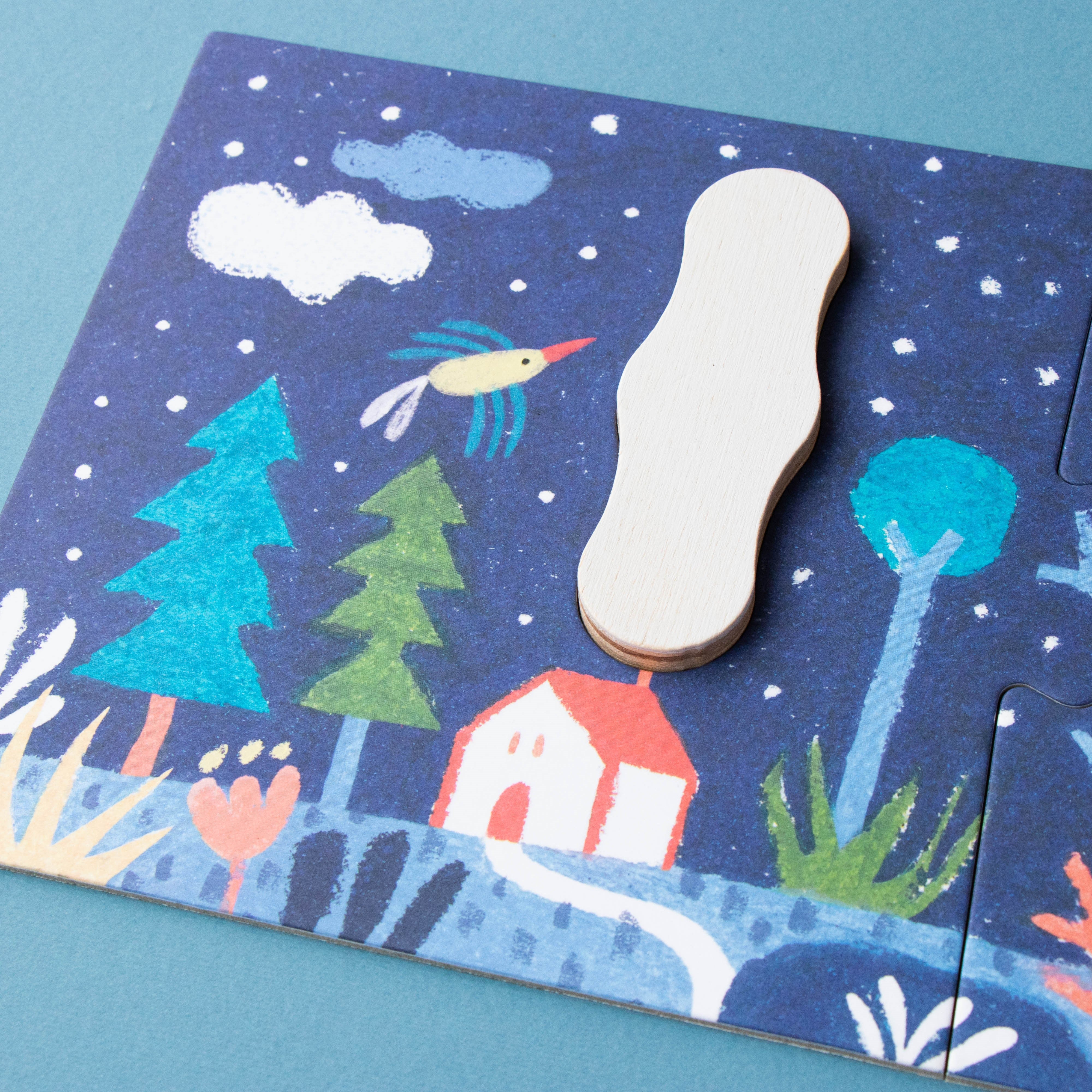 Is it the moon or a ship? A game to stimulate imagination! Assemble the puzzles and insert the wooden pieces.