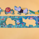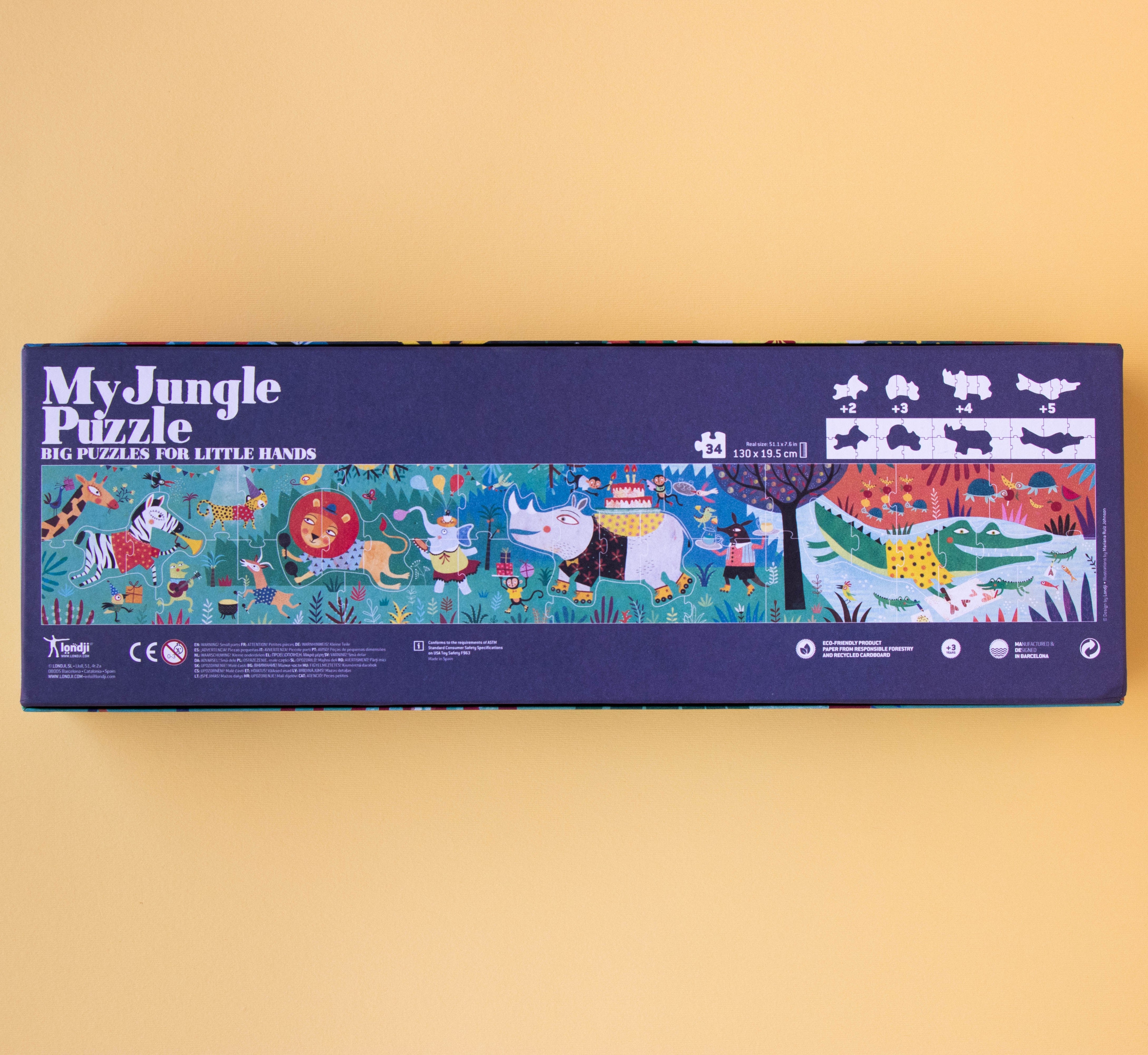Illustrations by Mariana Ruiz Johnson Made using recycled cardboard and paper and finished with plant-based colours. Packaged in sturdy cardboard box Puzzle size 140 x 21 cm. Box Size 45,5 x 15 x 6,5 cm. Made in Barcelona