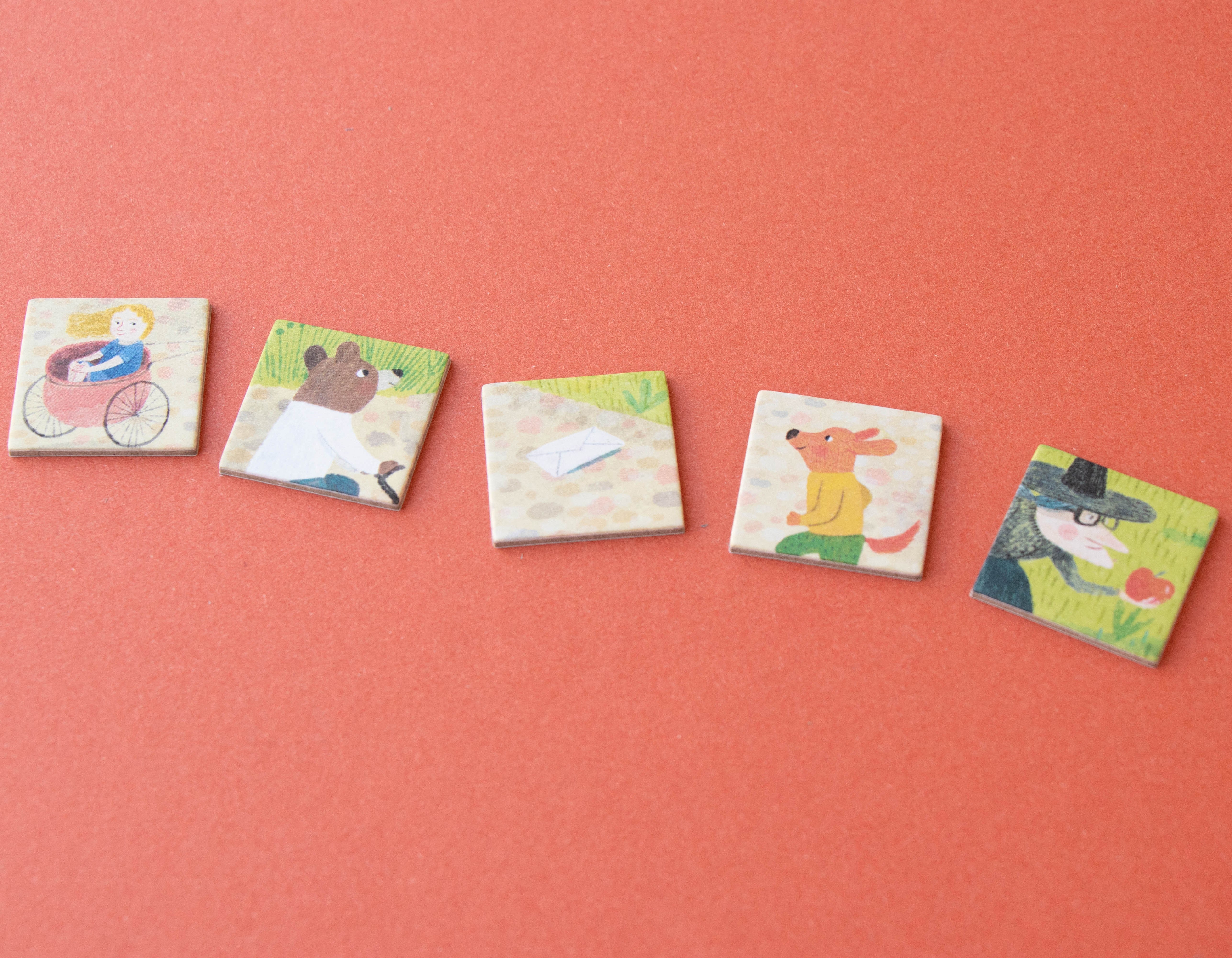 A puzzle for inventing stories, enhancing creativity, imagination and observation skills. Includes 100 puzzle pieces, 48 picture cards and instructions with different game suggestions. Recommended for ages 5 to 8 years old.