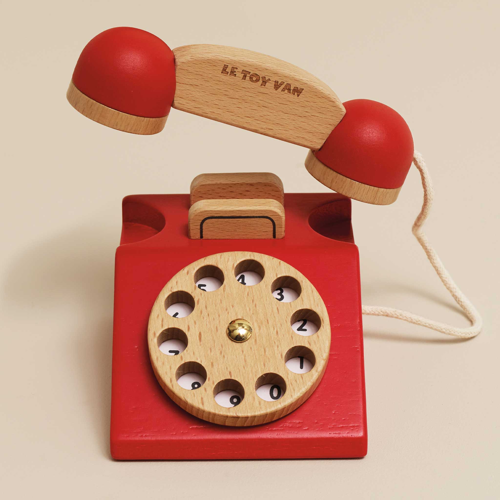 Made from natural, durable rubber-wood, painted in a striking red shade and finished with a flourish of gold paint for a touch of luxury. Featuring a ringing bell within the handset for role play scenarios. The digits and realistic spinning wheel are designed to encourage number recognition.