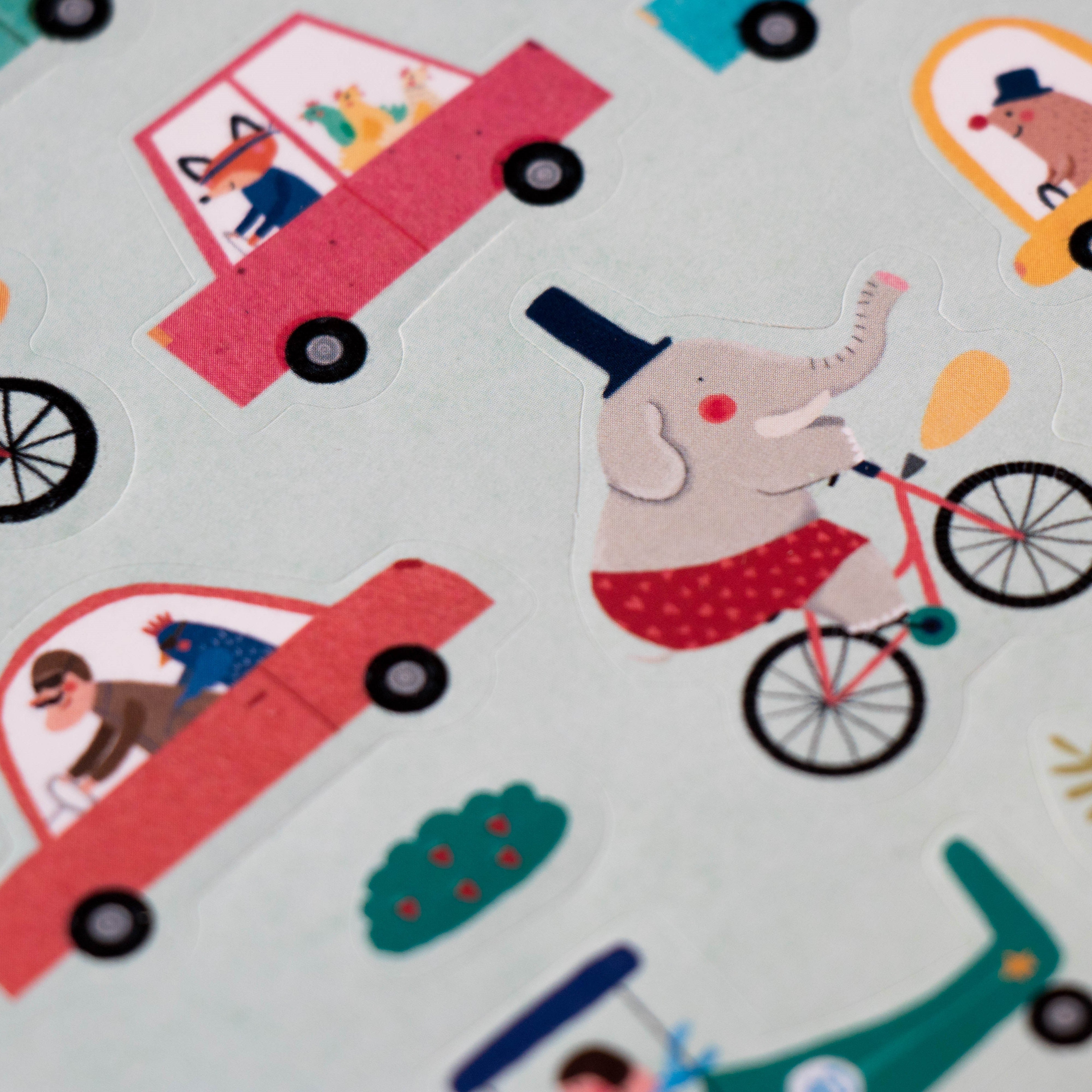 A set of 150 removable stickers of transport vehicles with different characters, houses, plants and trees, roads and traffic signs for you to build the city of your dreams on the scene you choose!