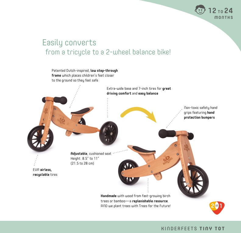 Start exploring the world on wheels! Is your little one eager to start riding but not quite ready for a balance bike? The Kinderfeets Tiny Tot 2-in-1 Bike offers even the tiniest ones the opportunity to develop their understanding of balance and coordination.