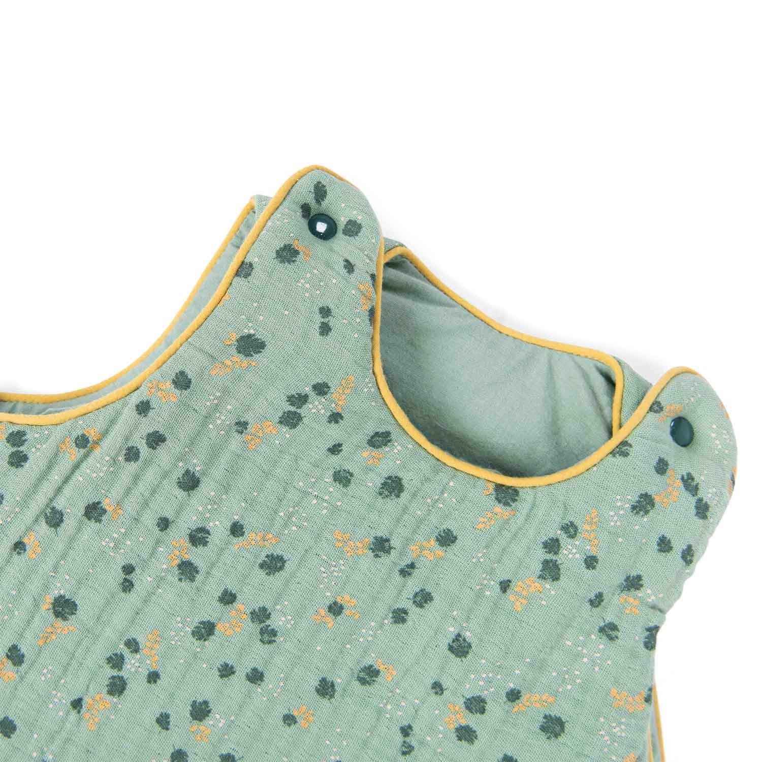0-6 months sleeping bag (TOG 3.8) made from warm, breathable printed sage OEKO-TEX? certified muslin with a green fabric lining. Zip and press-stud fastening for easy dressing.